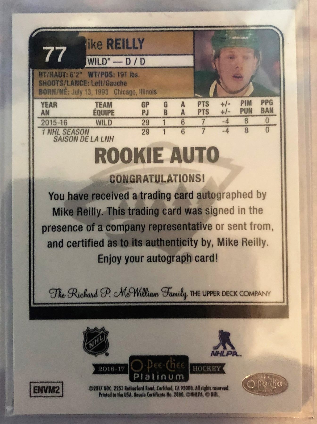 2016-17 O-Pee-Chee Mike Reilly Rookie Autograph #R-MR