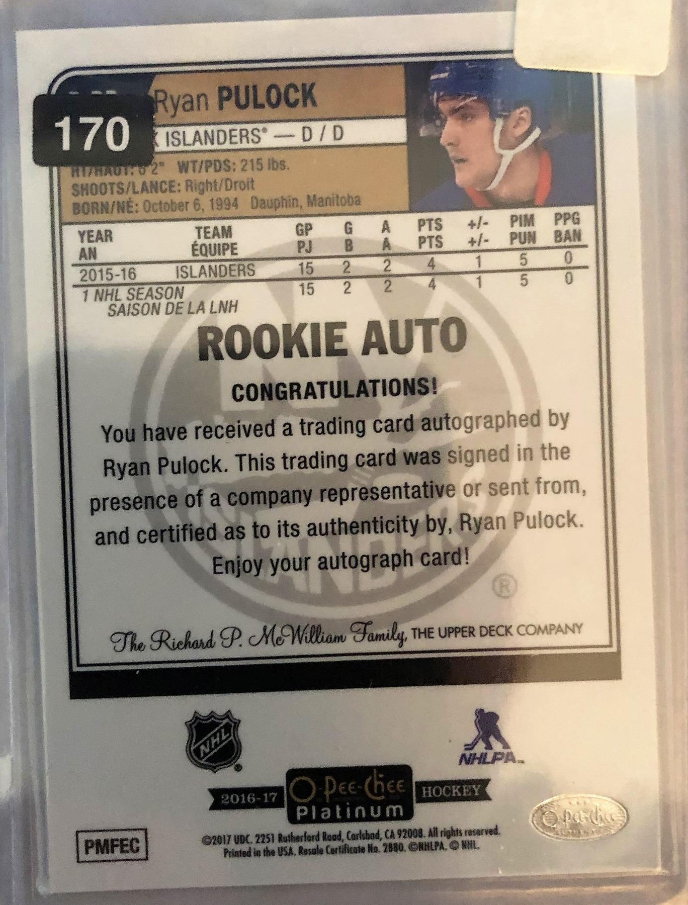 2016-17 O-Pee-Chee Ryan Pulock Rookie Autograph #R-RP