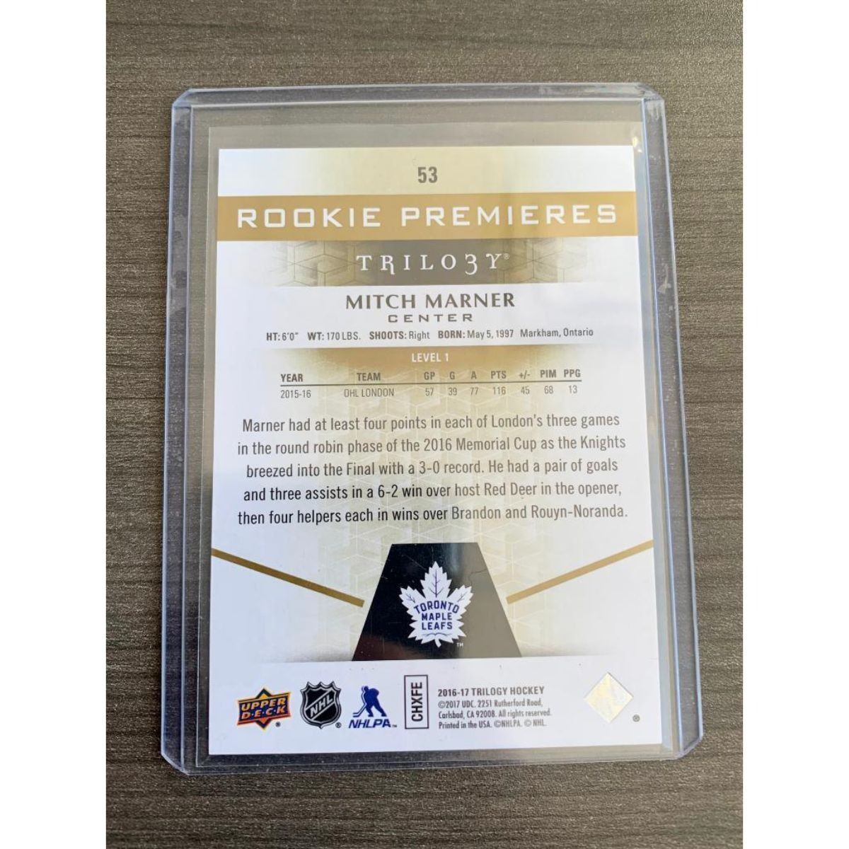 2016-17 UD TRILOGY ROOKIE PREMIERES #53 MITCH MARNER #'D 8 817/999 MINT. Please view photos for further details.Â