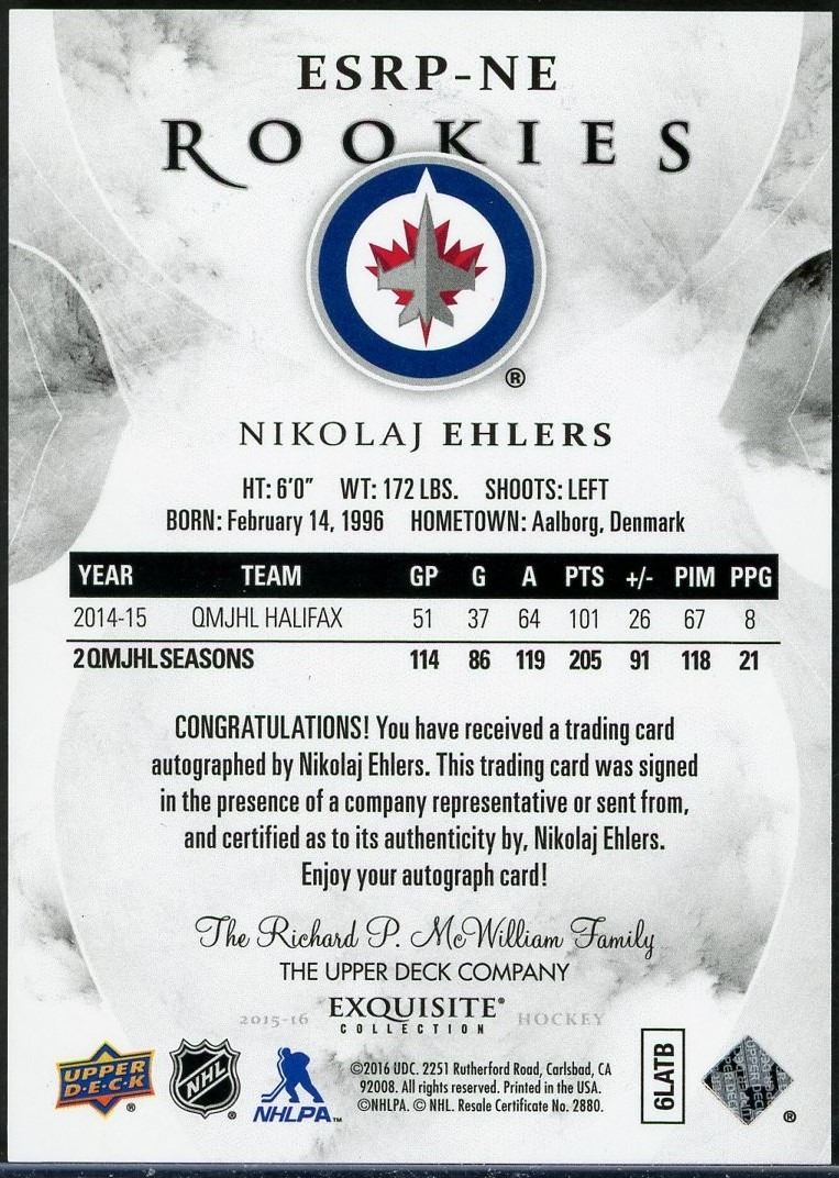 2016-17 UD Exquisite Rookies Signatures #'d to 149 of Jets star Nikolaj Ehlers