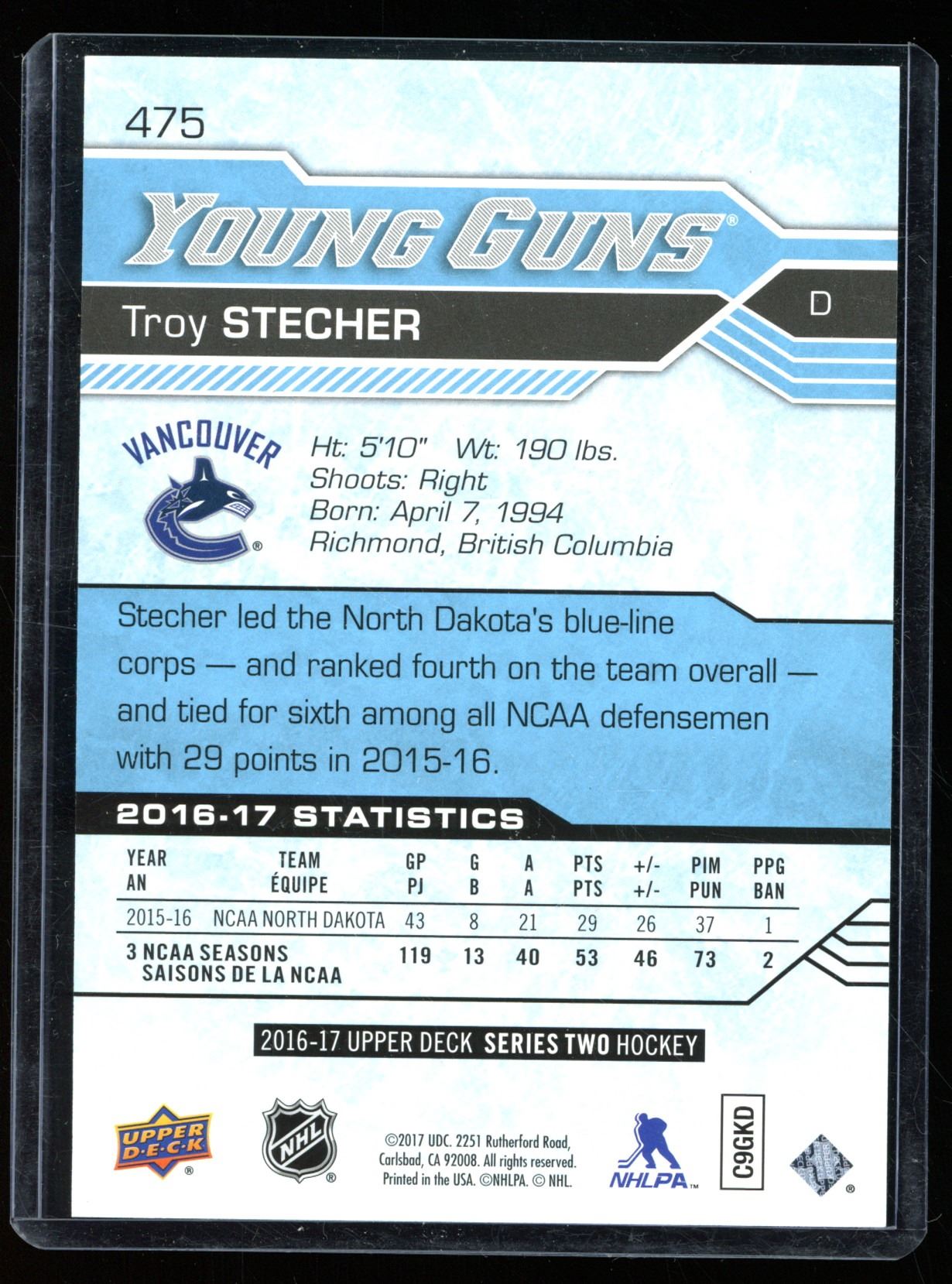 2016-17 Upper Deck Oversized #475 Troy Stecher YG