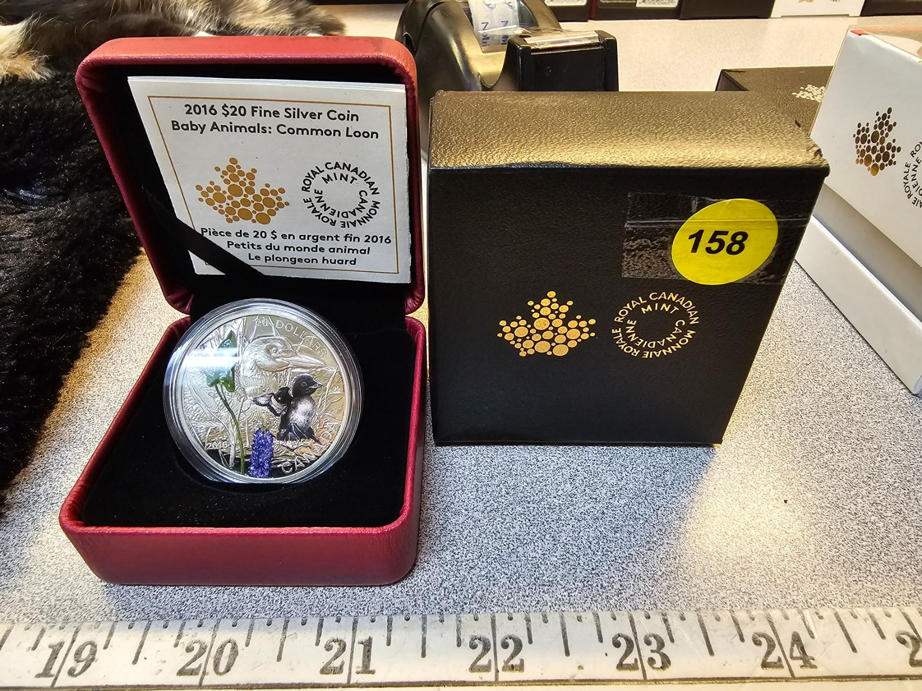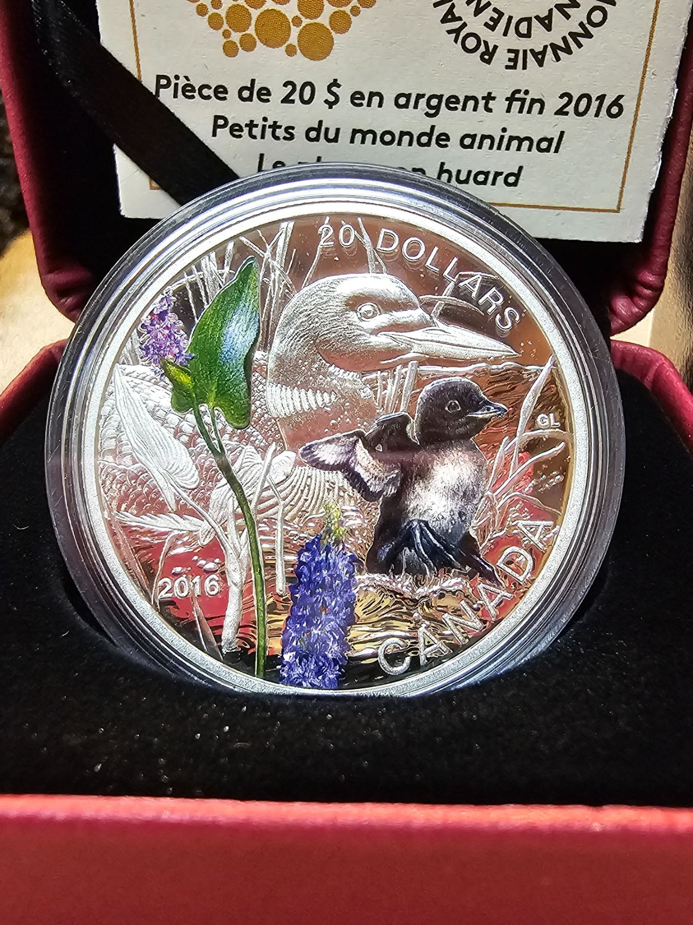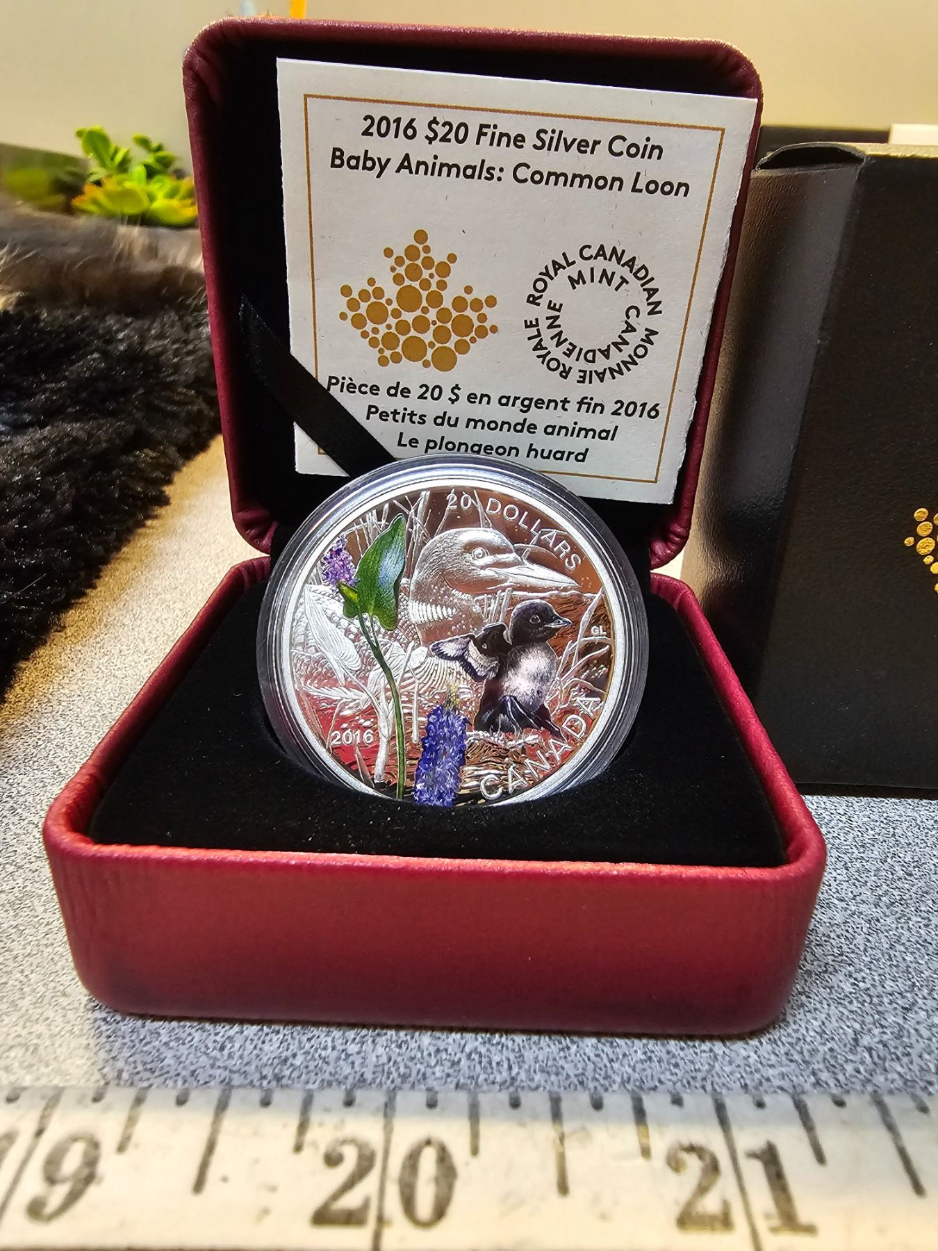 2016 $20 Baby Animals: Common Loon. Colourized baby loon along with its mother. Proof with Ultra Heavy Cameo. 99.99% pure Silver. Housed in its original Royal Canadian Mint case & box of issue, along with a Certificate of Authenticity.