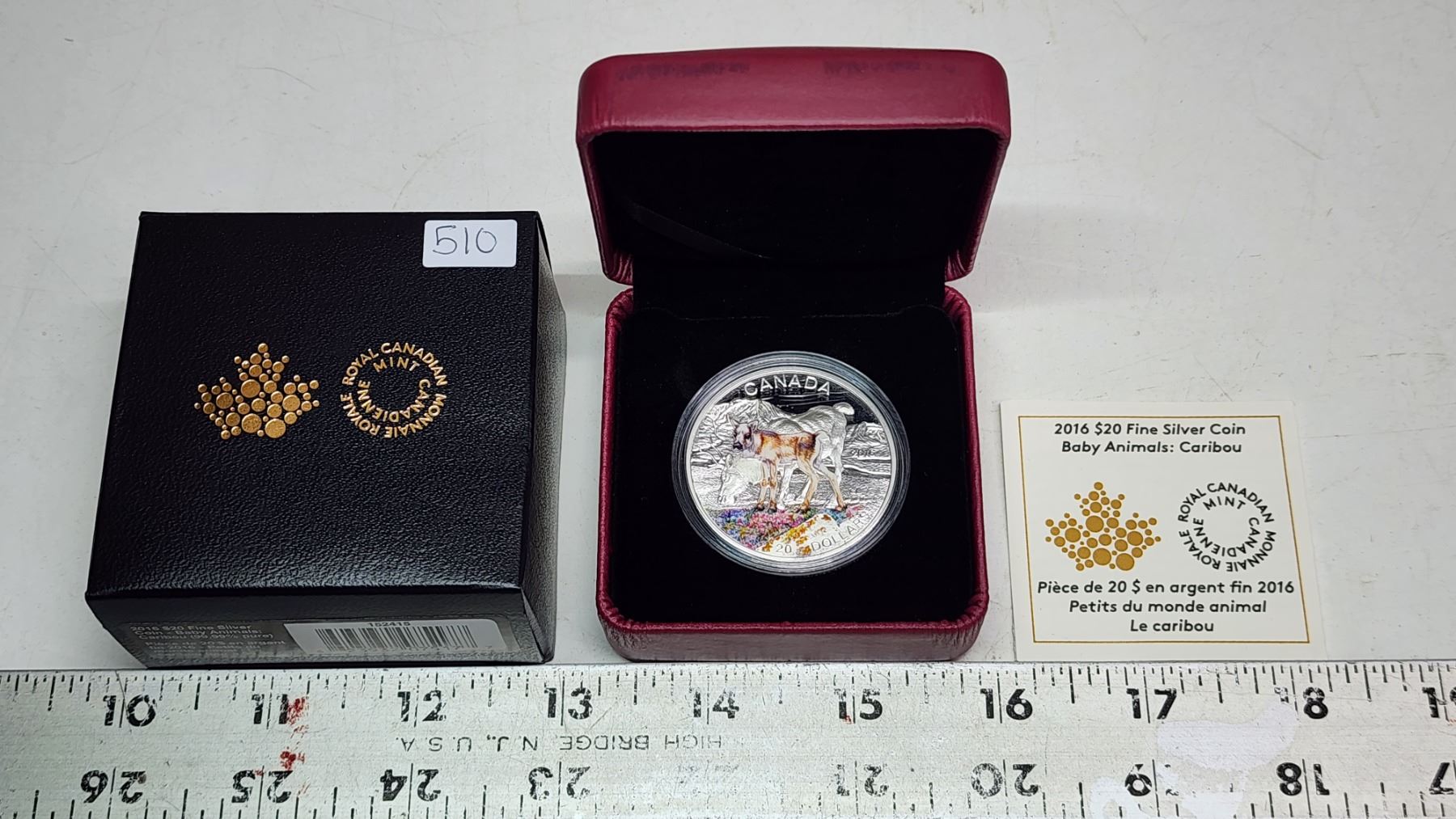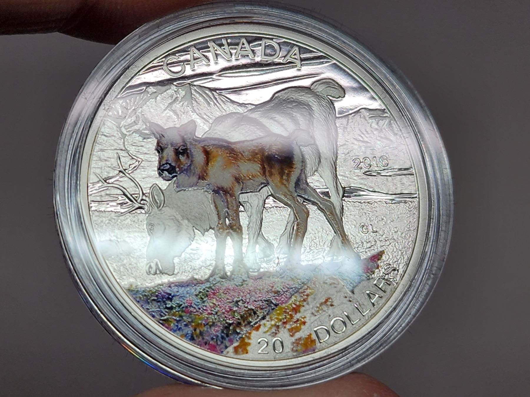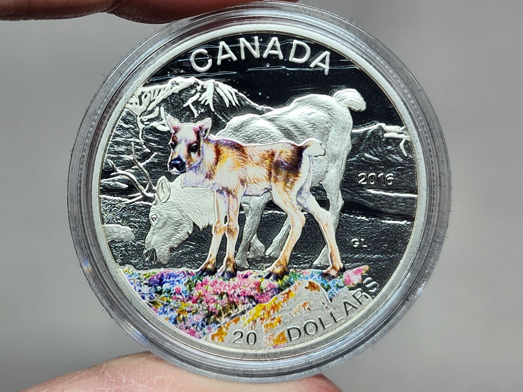 2016 $20 Baby Caribou & Mother. Colourized. 99.99% pure Silver. Proof. Housed in its original RCM case & box of issue.