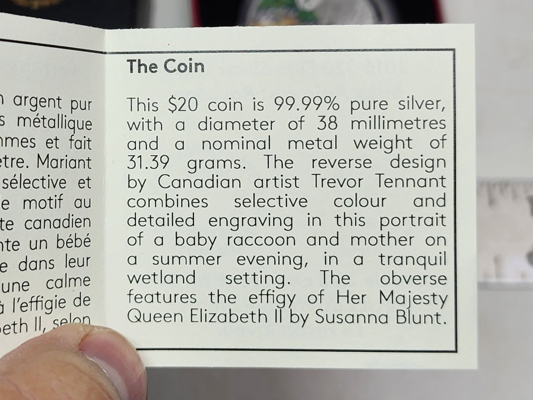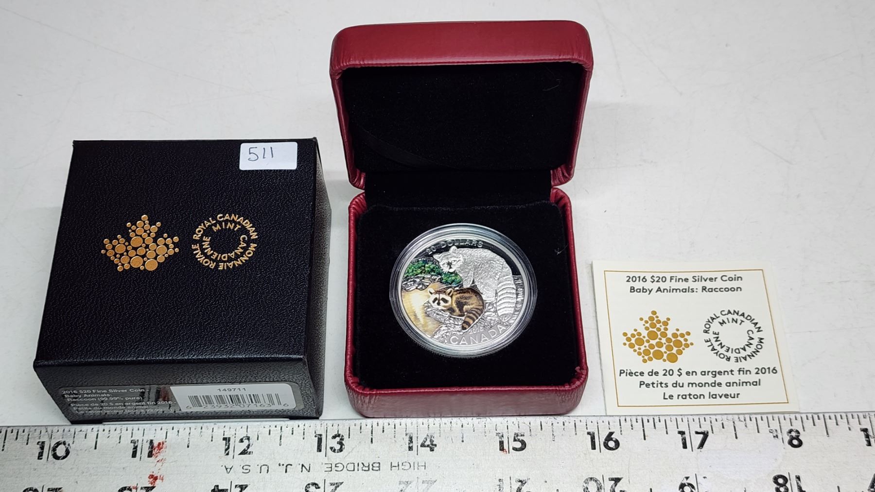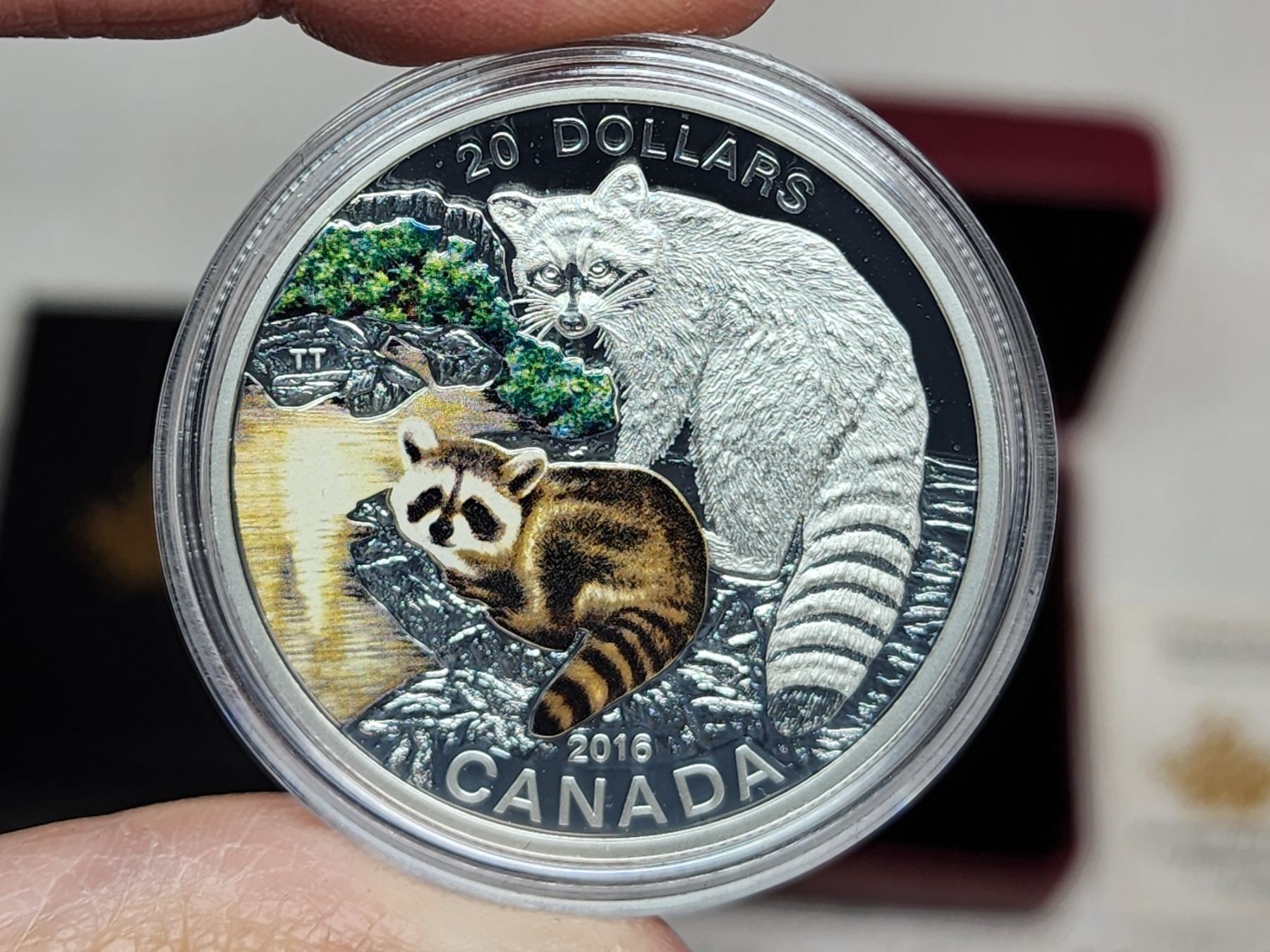 2016 $20 Baby Raccoon & Mother. Colourized. 99.99% pure Silver. Proof. Housed in its original RCM case & box of issue.