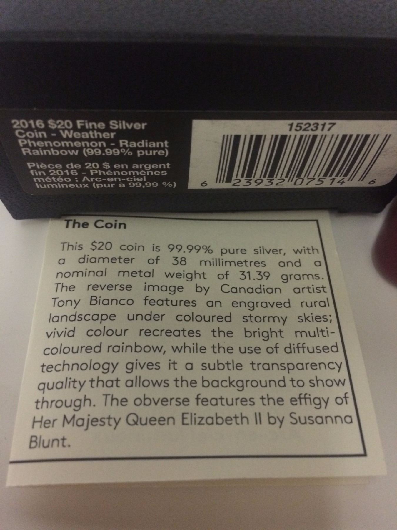 2016 $20 Fine Silver Coin-Weather Phenomenon-Radiant Rainbow ( 99% pure )