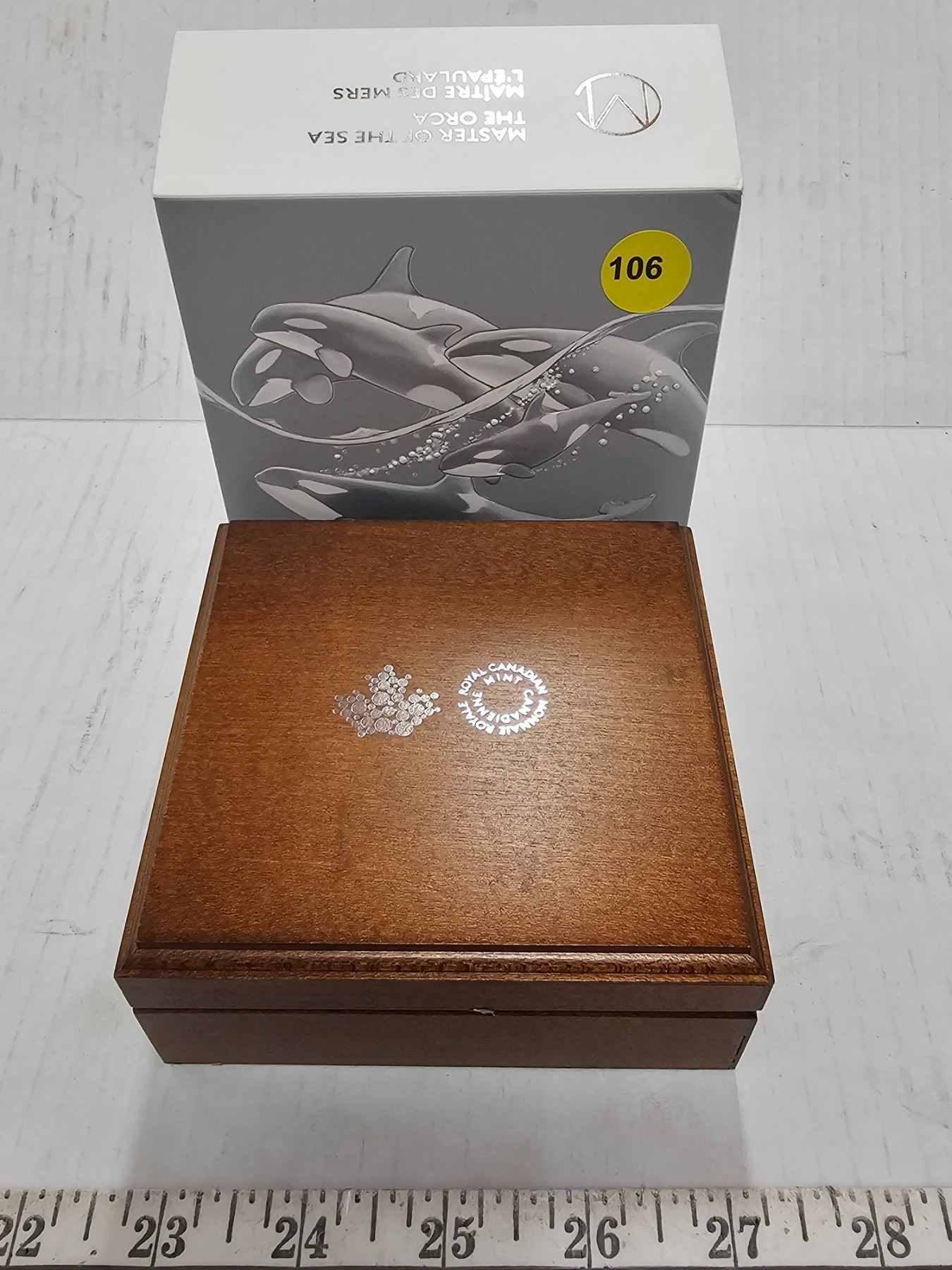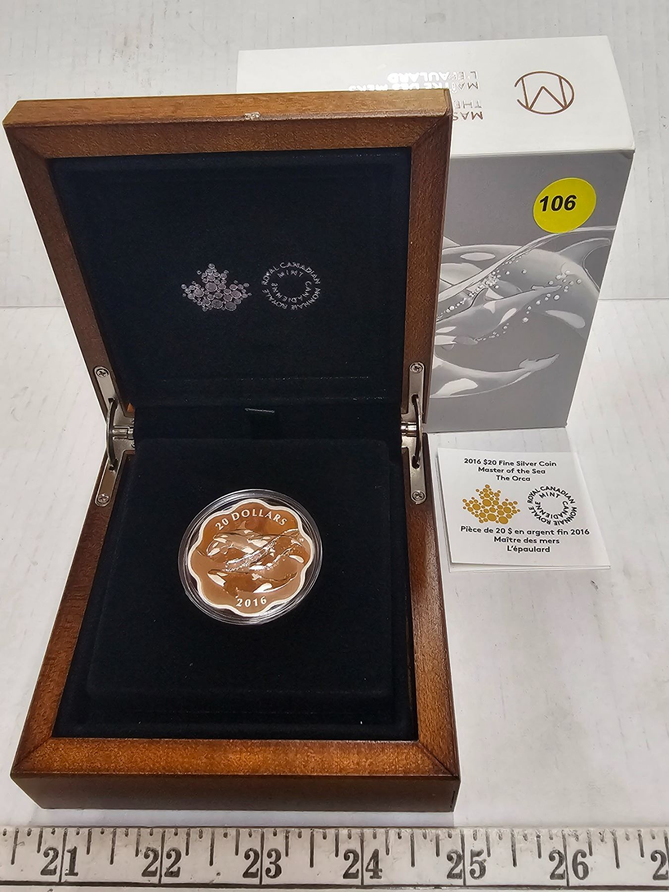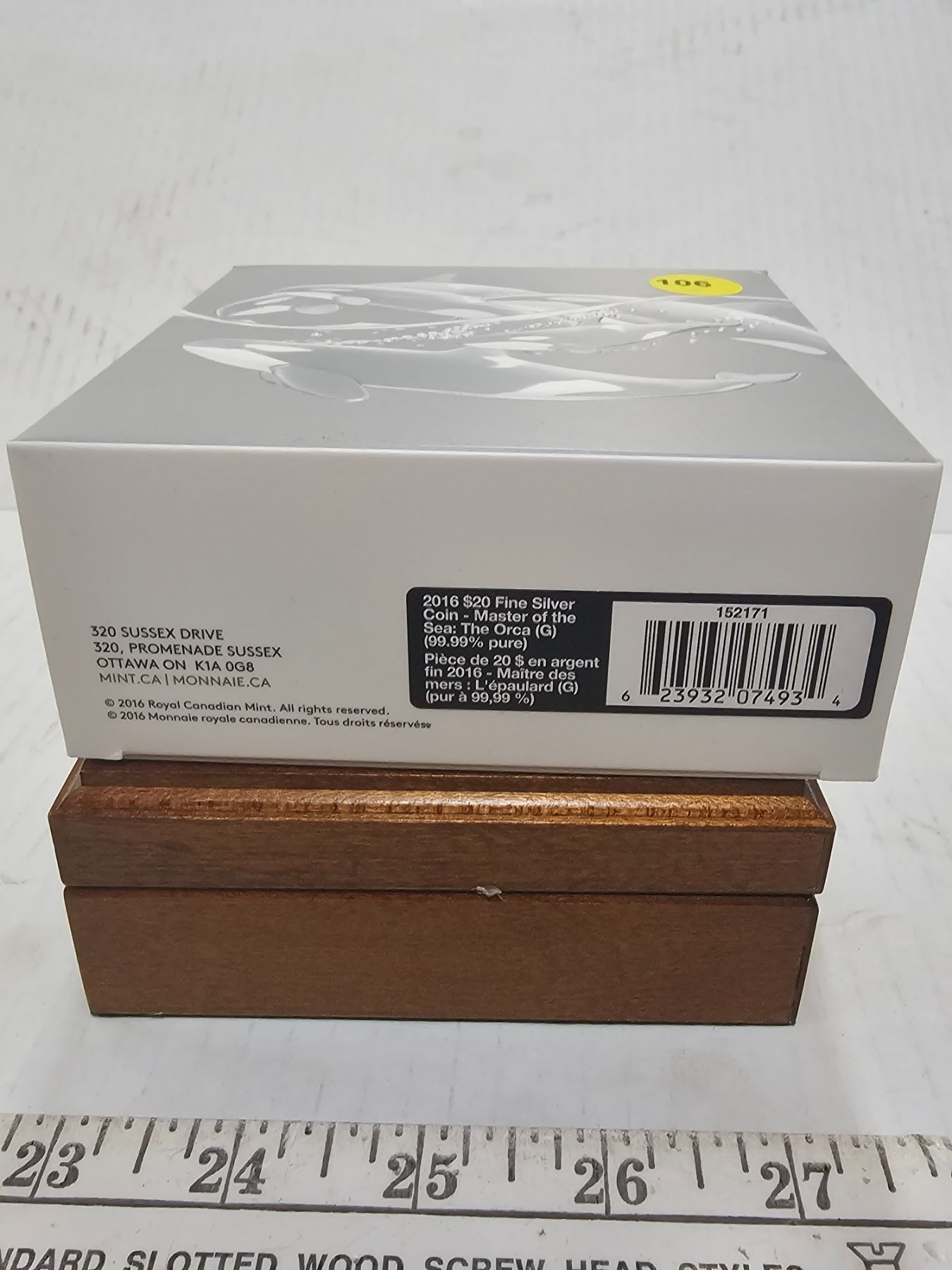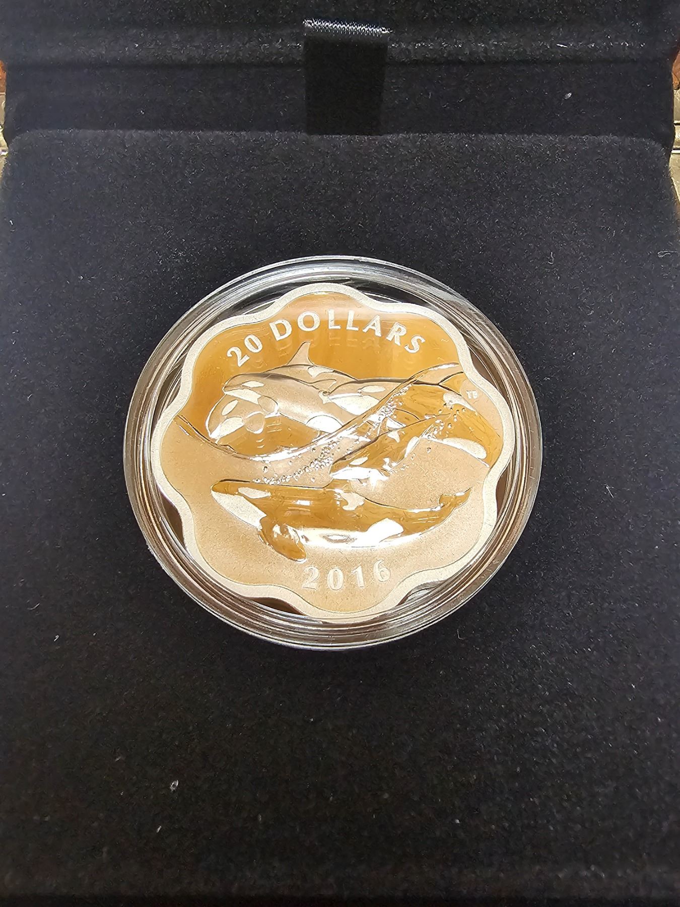 2016 $20 Master of the Sea: Orca. Scalloped Edges. Proof with Ultra Heavy Cameo. 99.99% pure Silver. Housed in its original Royal Canadian Mint case & box of issue plus Certificate of Authenticity.
