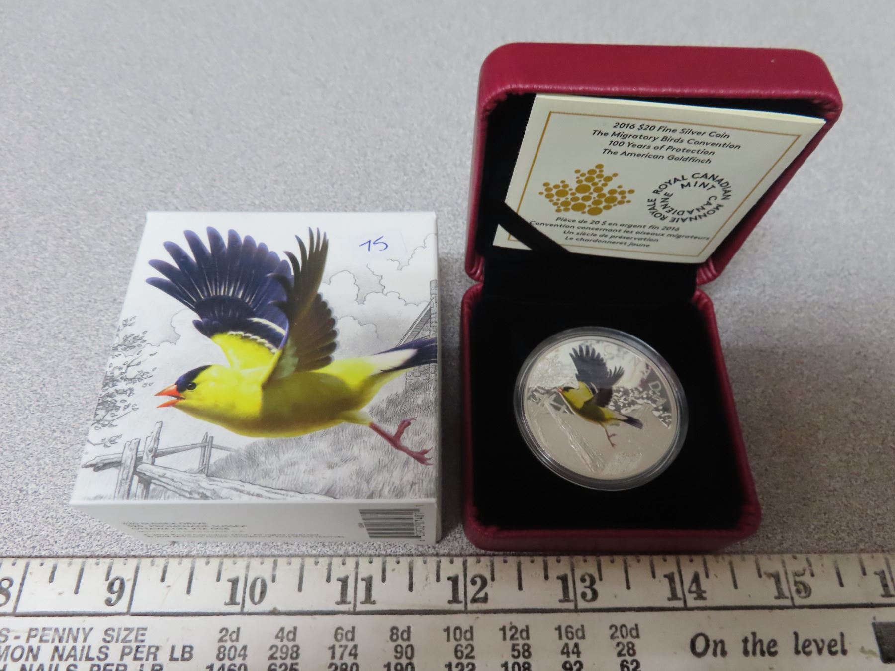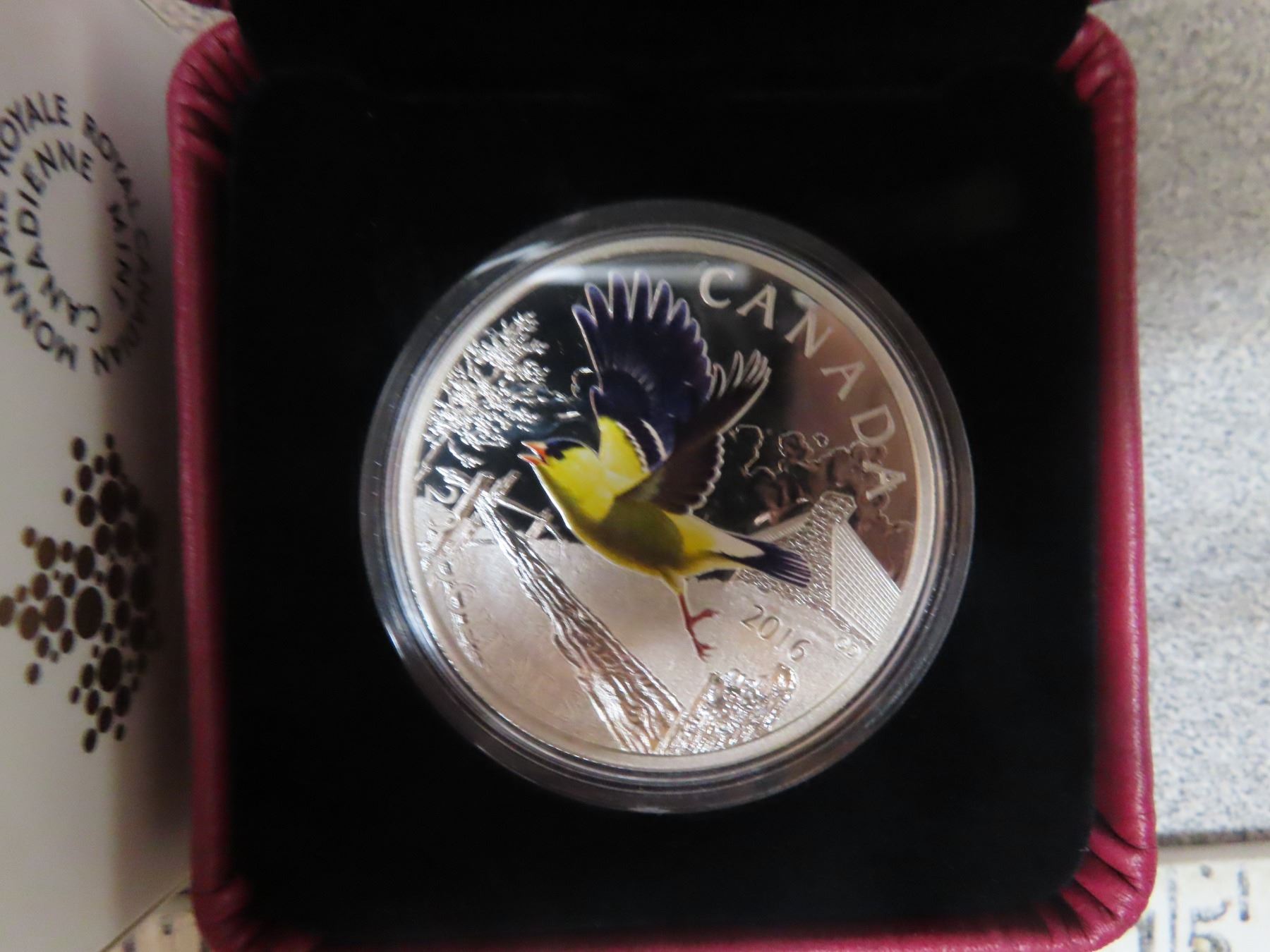 2016 $20 Migratory Birds: American Goldfinch. Colourized. Proof with Ultra Heavy Cameo. 99.99% pure Silver. Housed in its original Royal Canadian Mint case & box of issue plus Certificate of Authenticity.