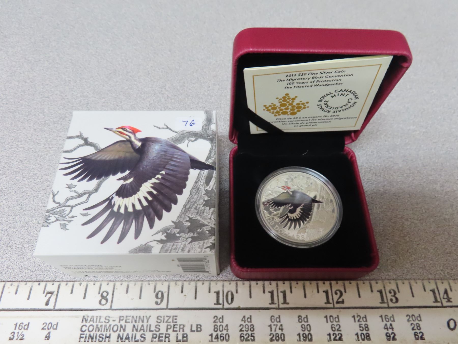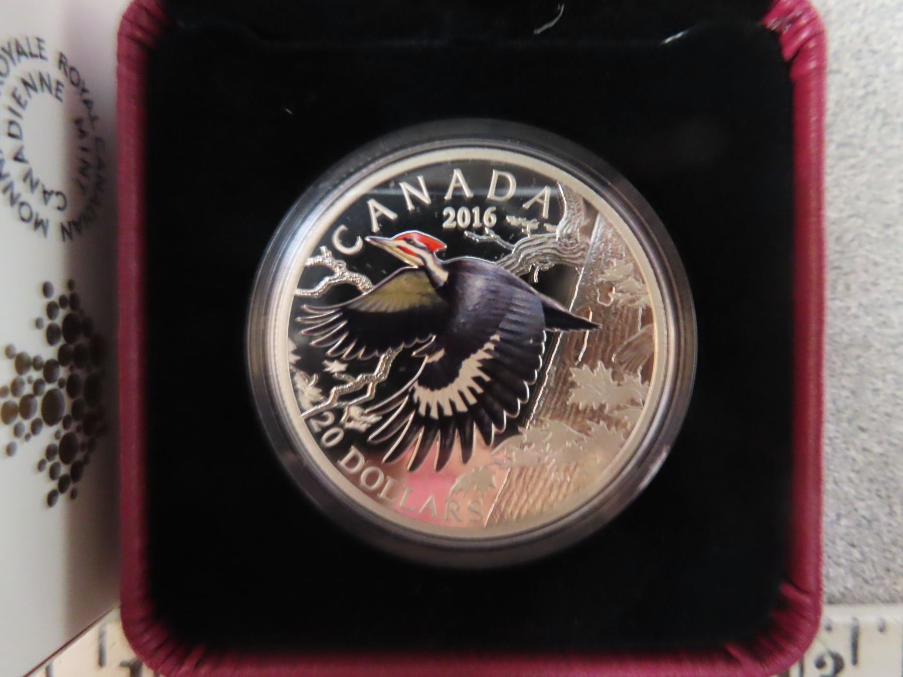 2016 $20 Migratory Birds: Pileated Woodpecker. Colourized. Proof with Ultra Heavy Cameo. 99.99% pure Silver. Housed in its original Royal Canadian Mint case & box of issue plus Certificate of Authenticity.