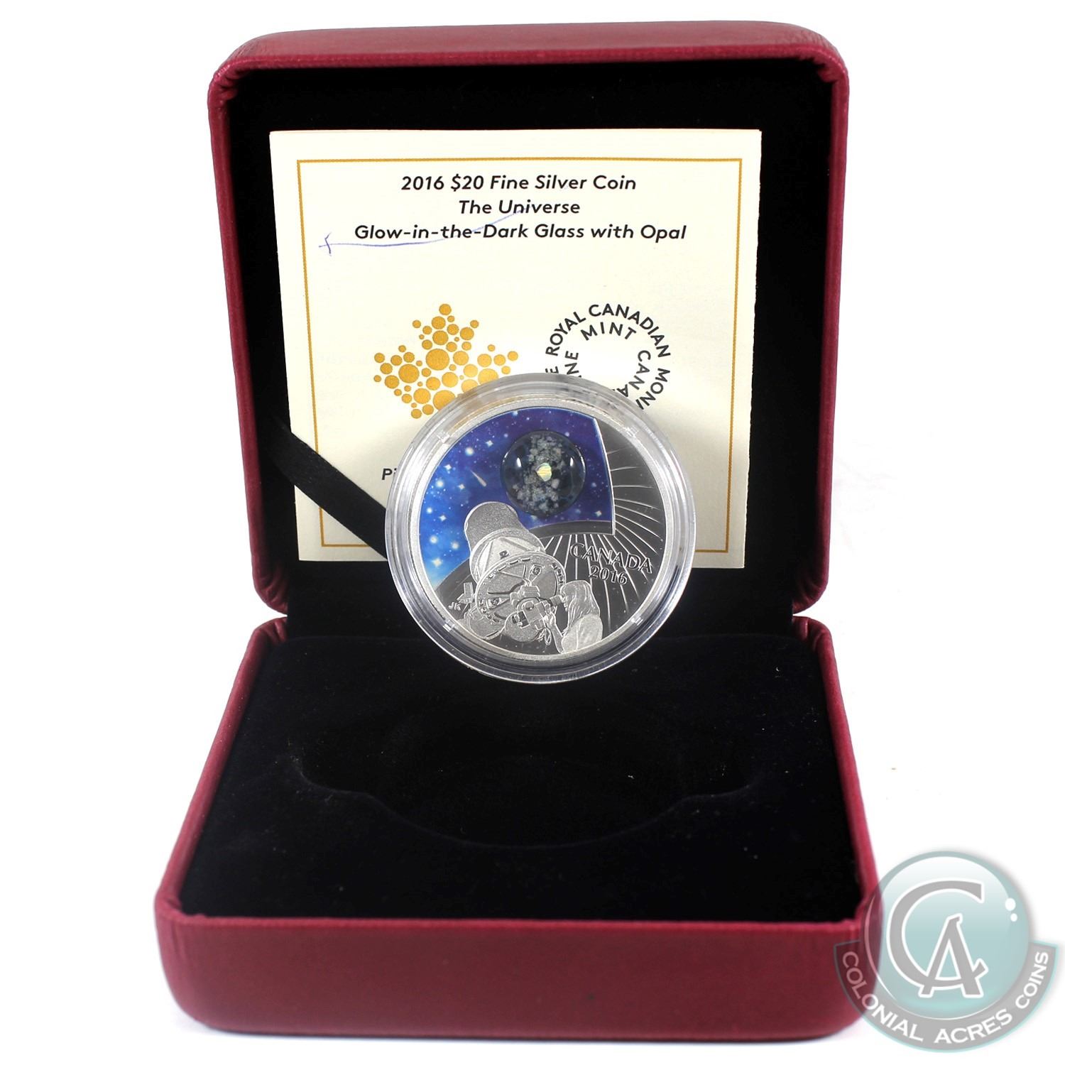2016 $20 The Universe Glass with Opal (Glow-In-Dark) Fine Silver Coin (TAX Exempt). Coin comes encapsulated with clam shell display and COA. (light toning spot on the coin)