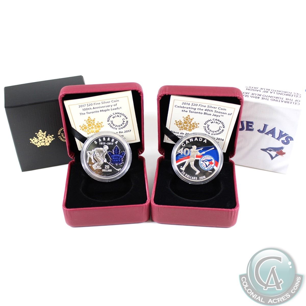 2016 $20 Toronto Blue Jays 40th Season & 2017 $20 100th Anniv. Toronto Maple Leafs Fine Silver Coins (Tax Exempt) Please note there are small cracks on rim of the capsules. 2pcs.