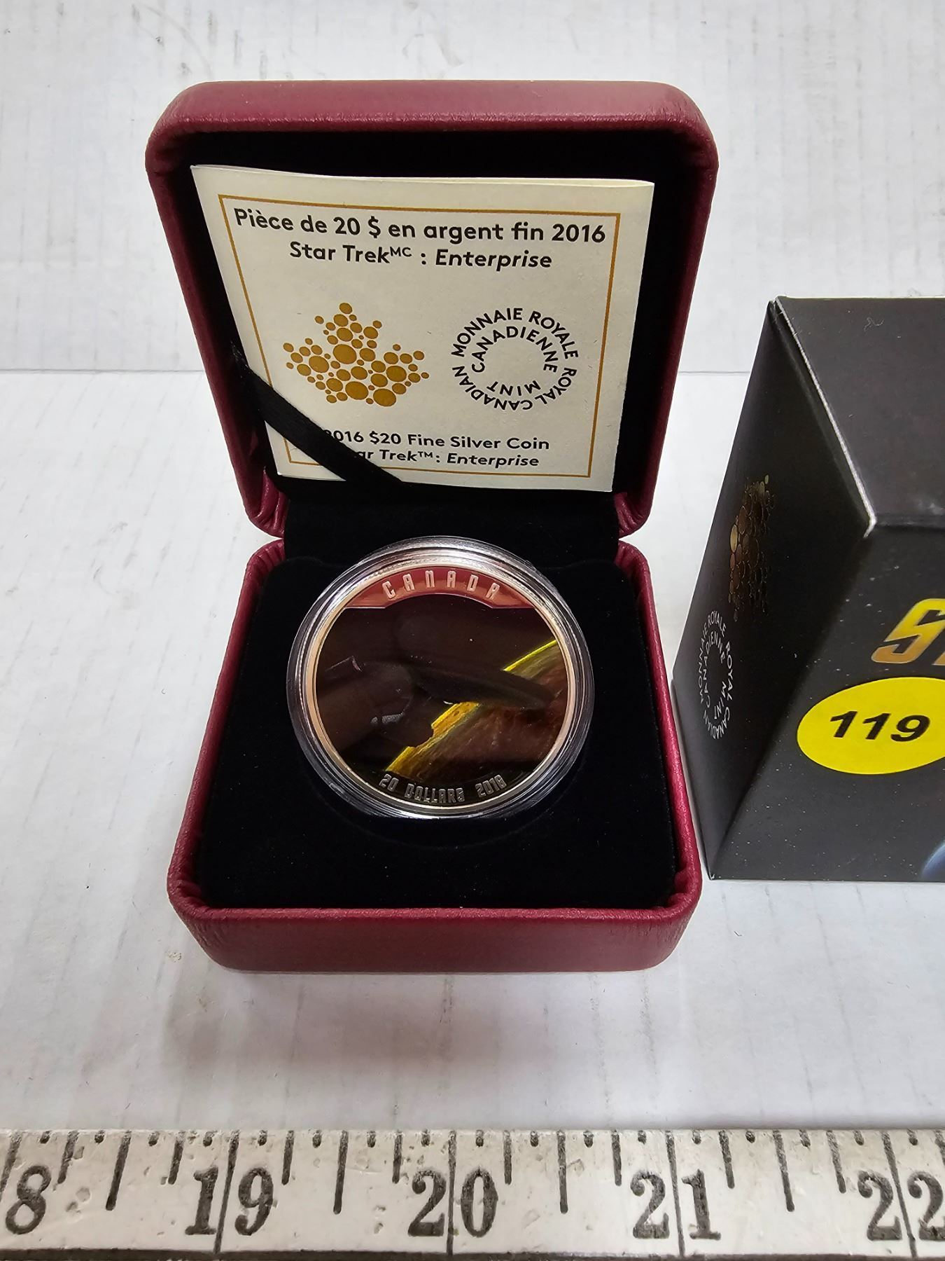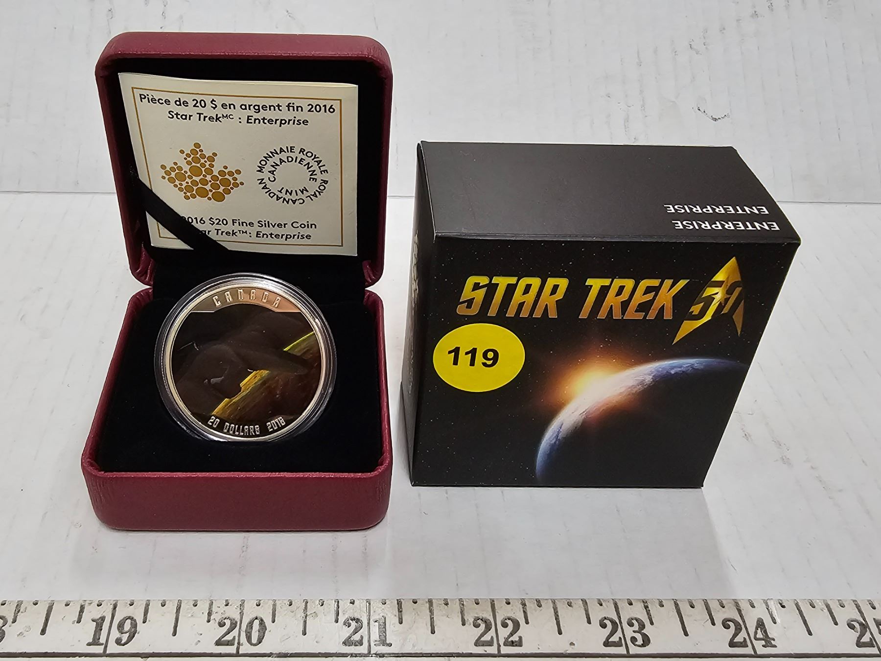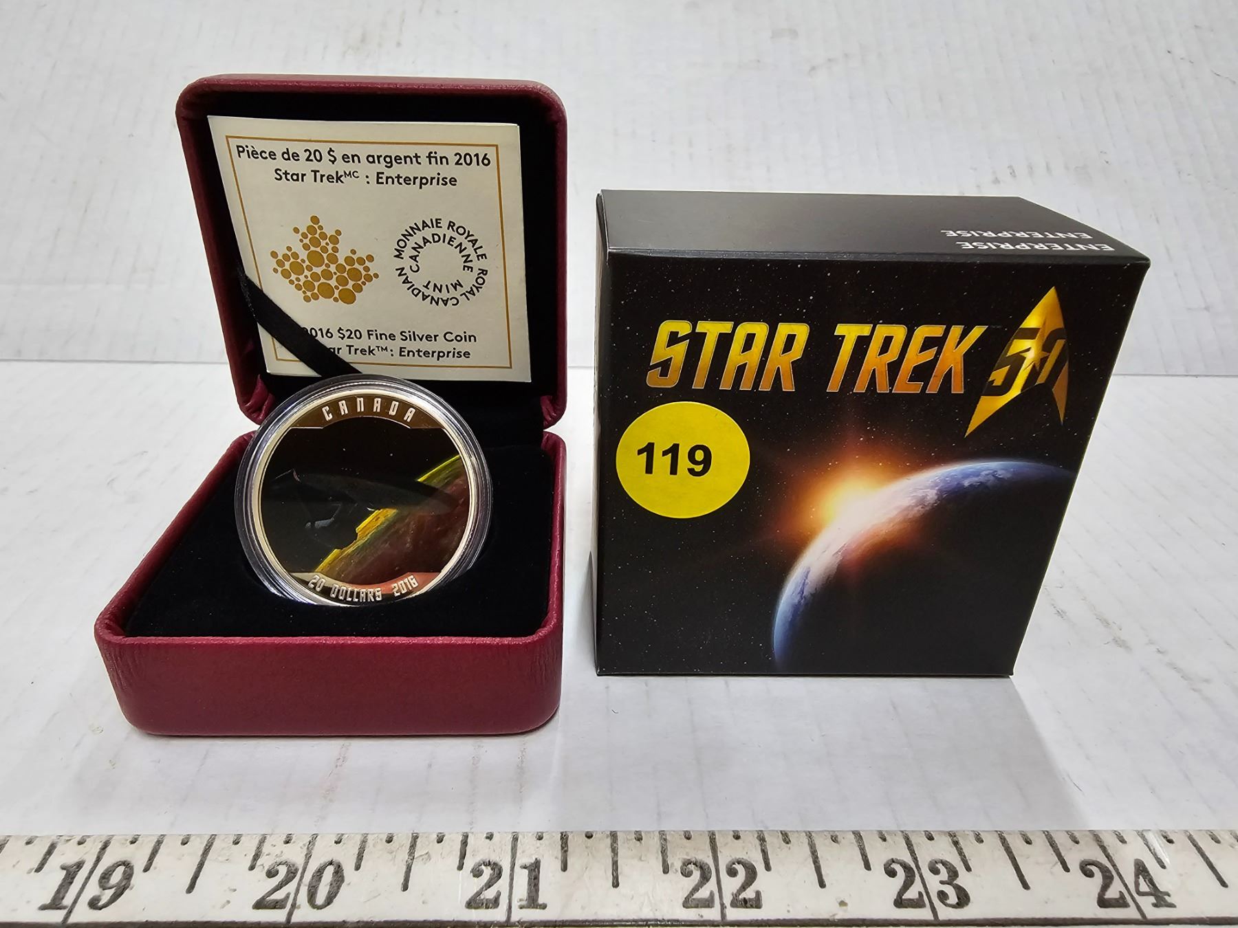 2016 $20 star trek enterprise. Colourized U.S.S. enterprise in orbit over a planet. Colourized proof with ultra heavy cameo. 99.99% pure silver. Housed in its origianl royal canadian mint case & box of issue, along with a certificate of authenticity