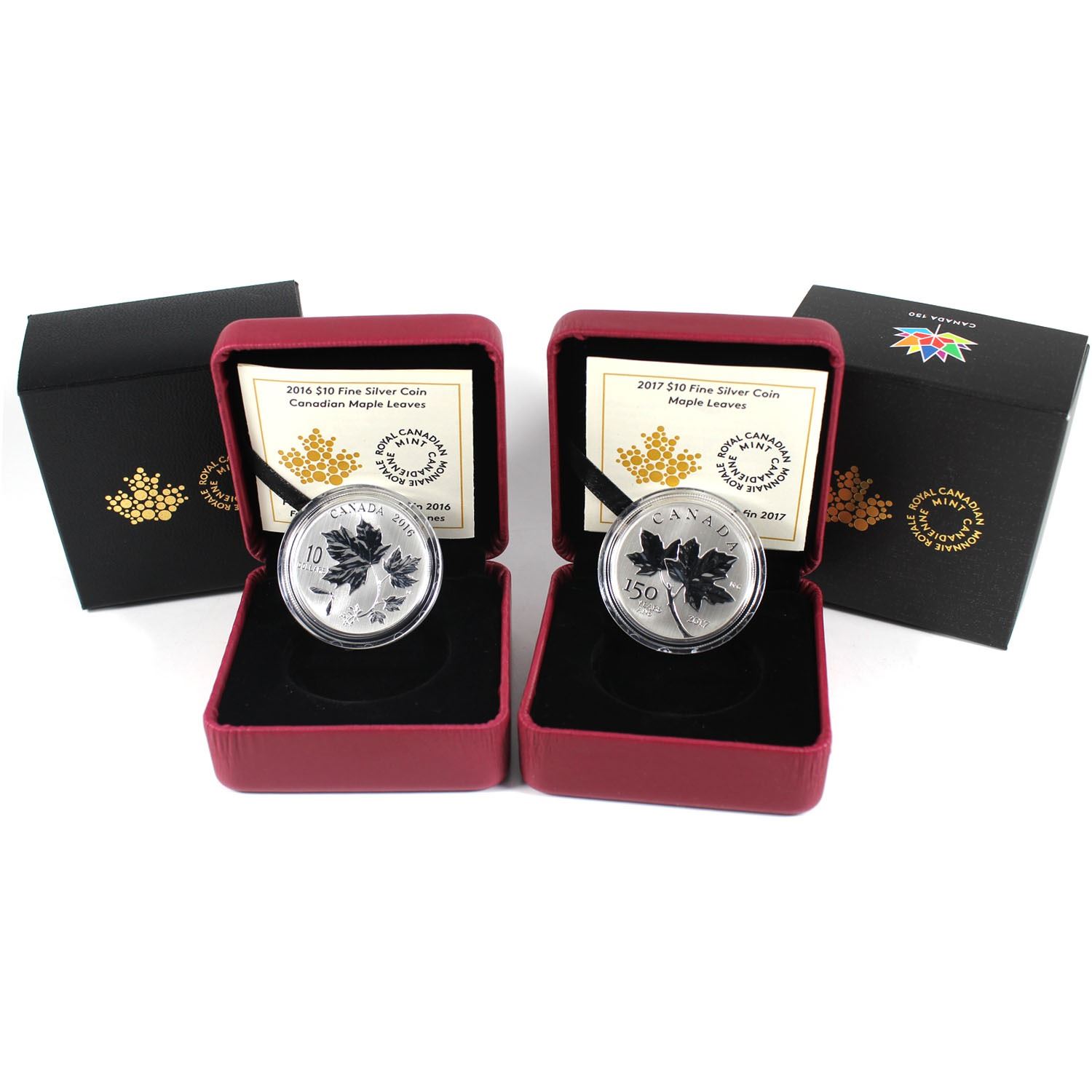 2016 & 2017 $10 Canadian Maple Leaves Fine Silver Coins (TAX Exempt). 2pcs.