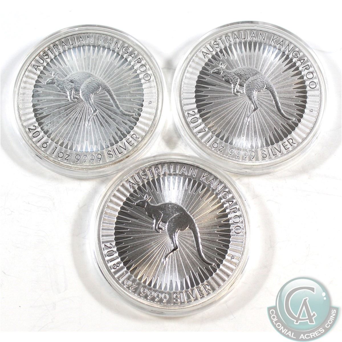 2016, 2017, 2018 Australia 1oz Fine Silver Kangaroo Coins (TAX Exempt). Coins come Encapsulated. Please note capsules may be scratched. 3pcs.