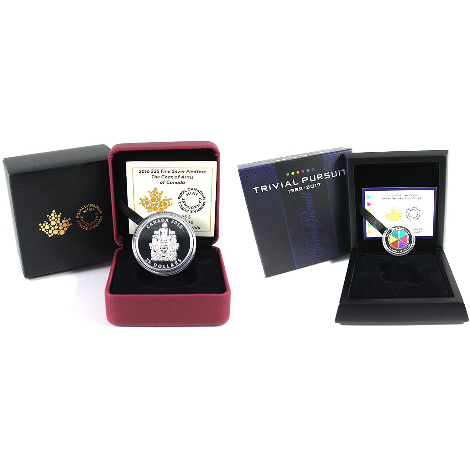 INCLUDES: 2016 Piedfort - Canadian Coat of Arms Fine Silver & 2017 35th Anniversary of Trivial Pursuit Silver in Original Packaging. w/ COAs. Toned. Scratched capsules. Minor wear to outer box. 2pcs.