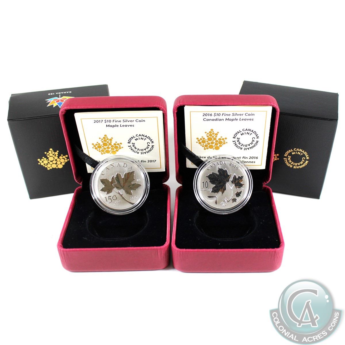 2016 & 2017 Canada $10 Maple Leaves Fine Silver Coins (Tax Exempt). Please note the 2017 outer black box is bent a bit. 2pcs