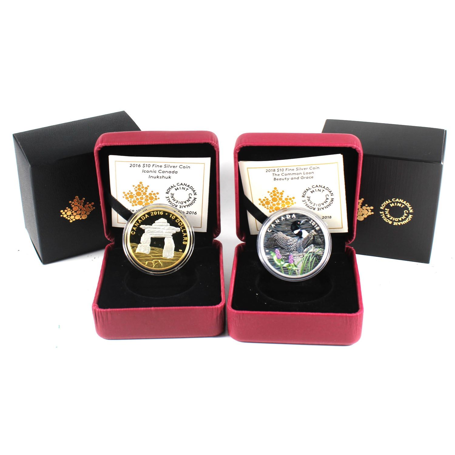 2016 & 2018 Canada $10 Commemorative Fine Silver Coin Set (TAX Exempt). You will receive the 2016 Inukshuk, and 2018 Common Loon - Beauty and Grace. 2pcs.