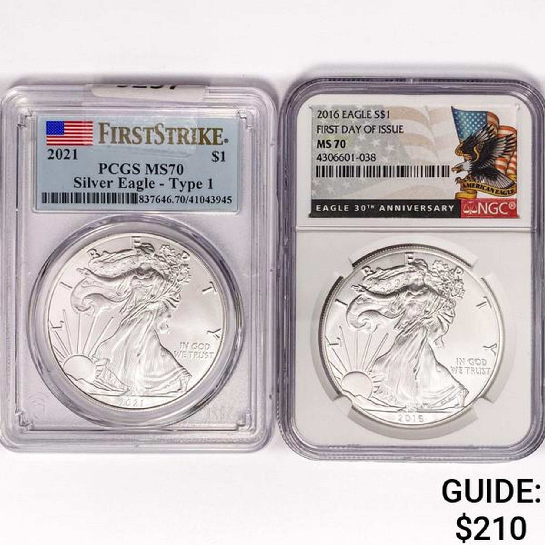 2016, 2021 (Set 2) American Silver Eagle MS70
