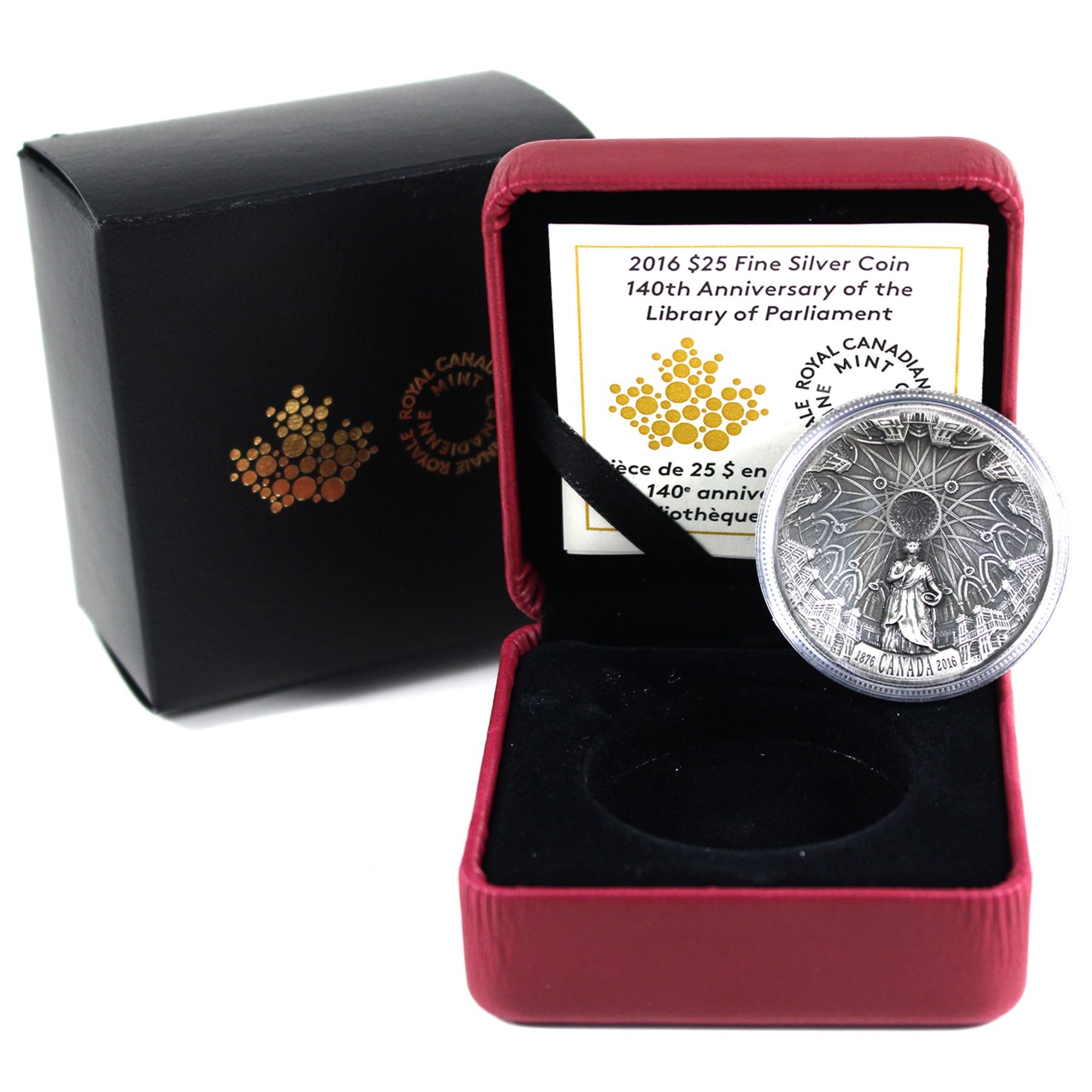 2016 $25 140th Anniversary of the Library of Parliament, Fine Silver Concave Coin With Antique Finish. Mintage of Only 6000! Taped outer sleeve (Tax Exempt)