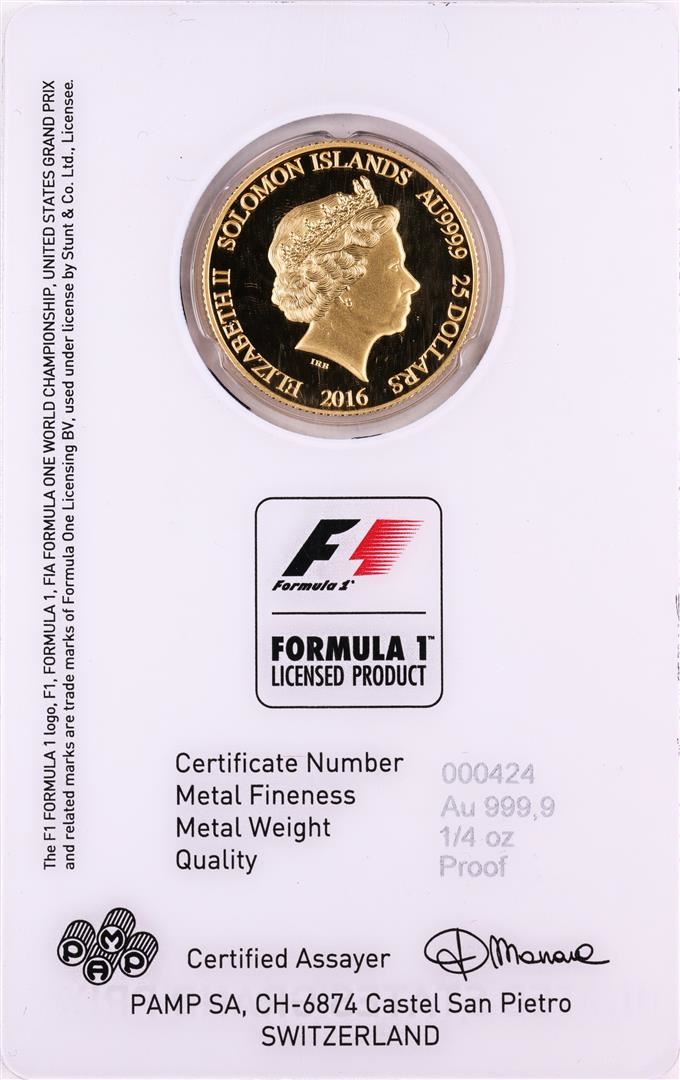 One 2016 $25 Proof Solomon Islands Formula One United States Grand Prix Gold Coin.