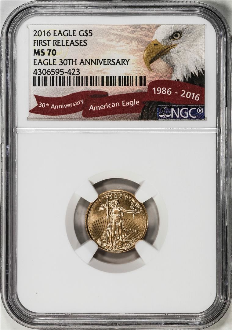 2016 $5 American Gold Eagle Coin NGC MS70 First Releases 30th Anniversary