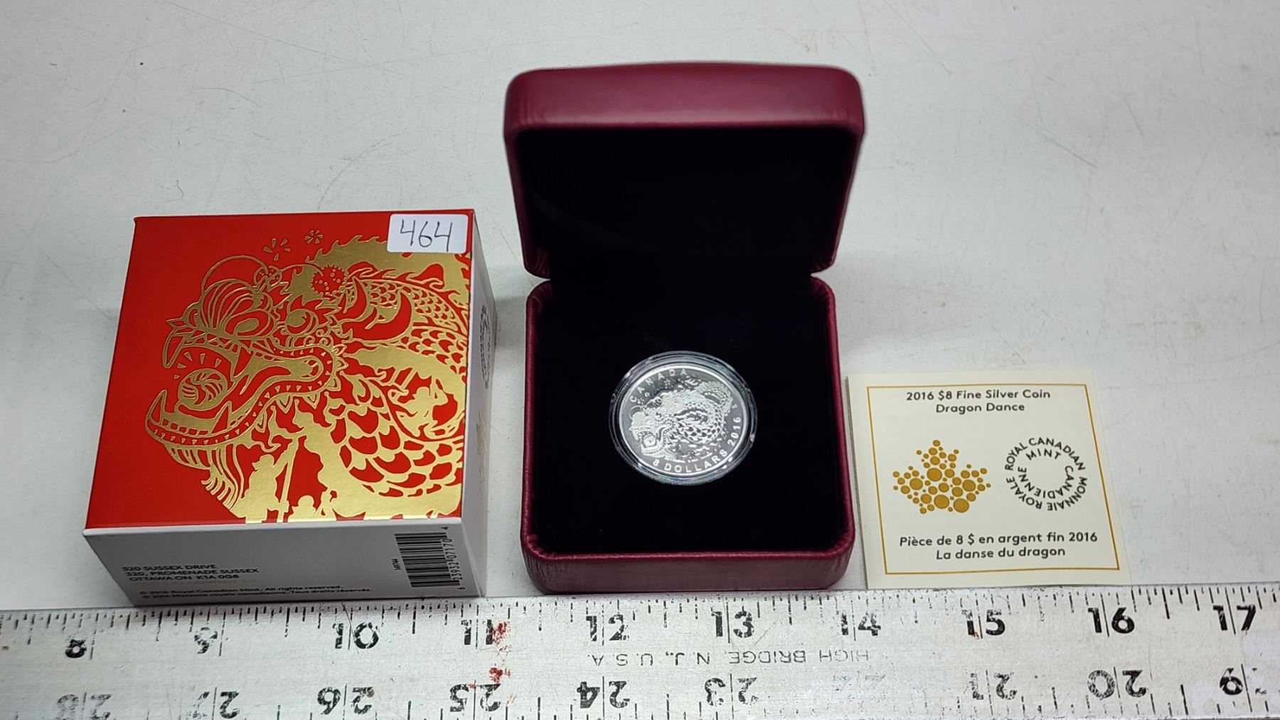 2016 $8 Dragon Dance. 99.99% pure Silver. Proof. Housed in its original RCM case & box of issue.