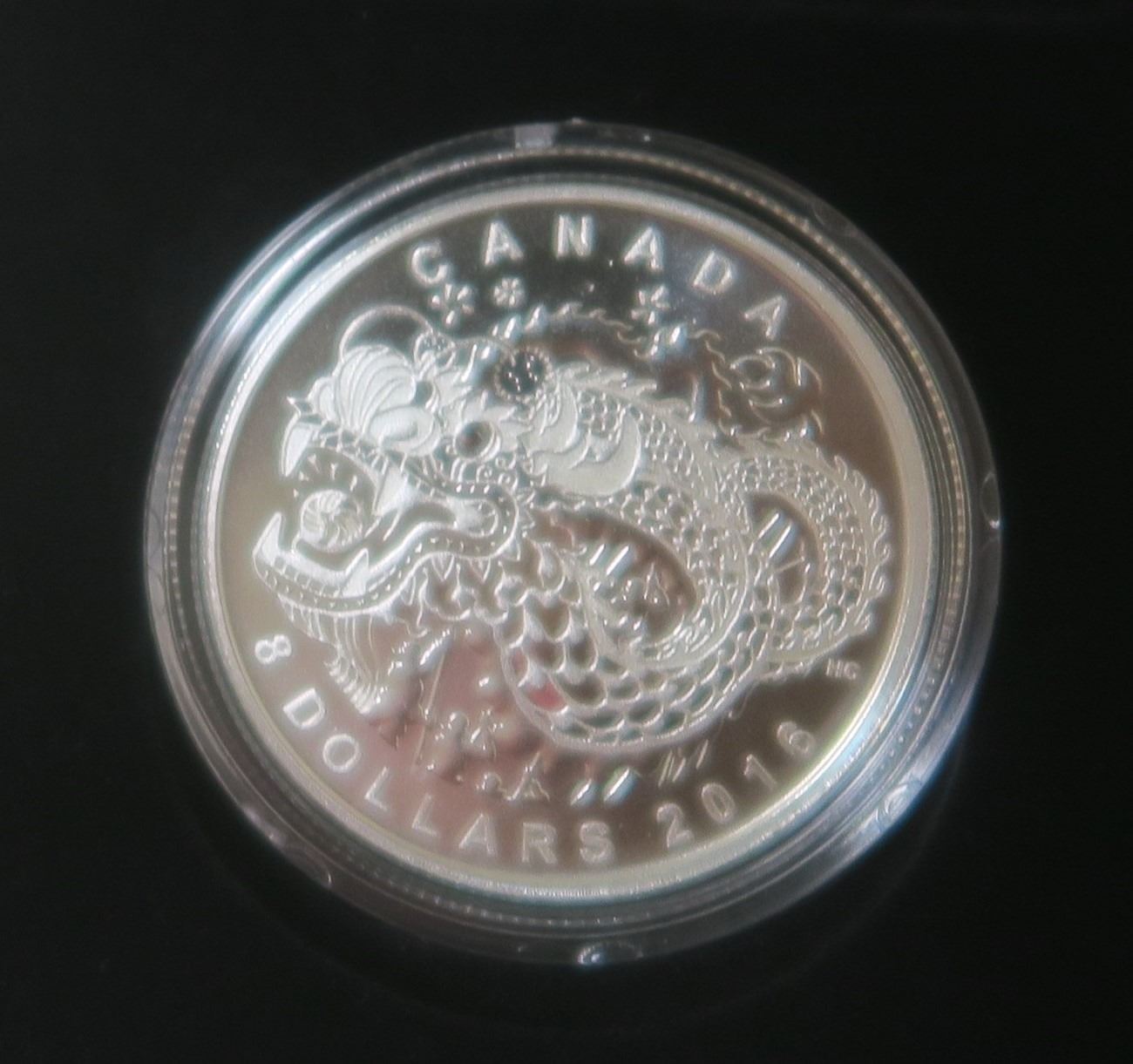 2016 $8 Dragon Dance. 99.99% pure Silver. Proof with Ultra Heavy Cameo. Housed in its original RCM case & box of issue.