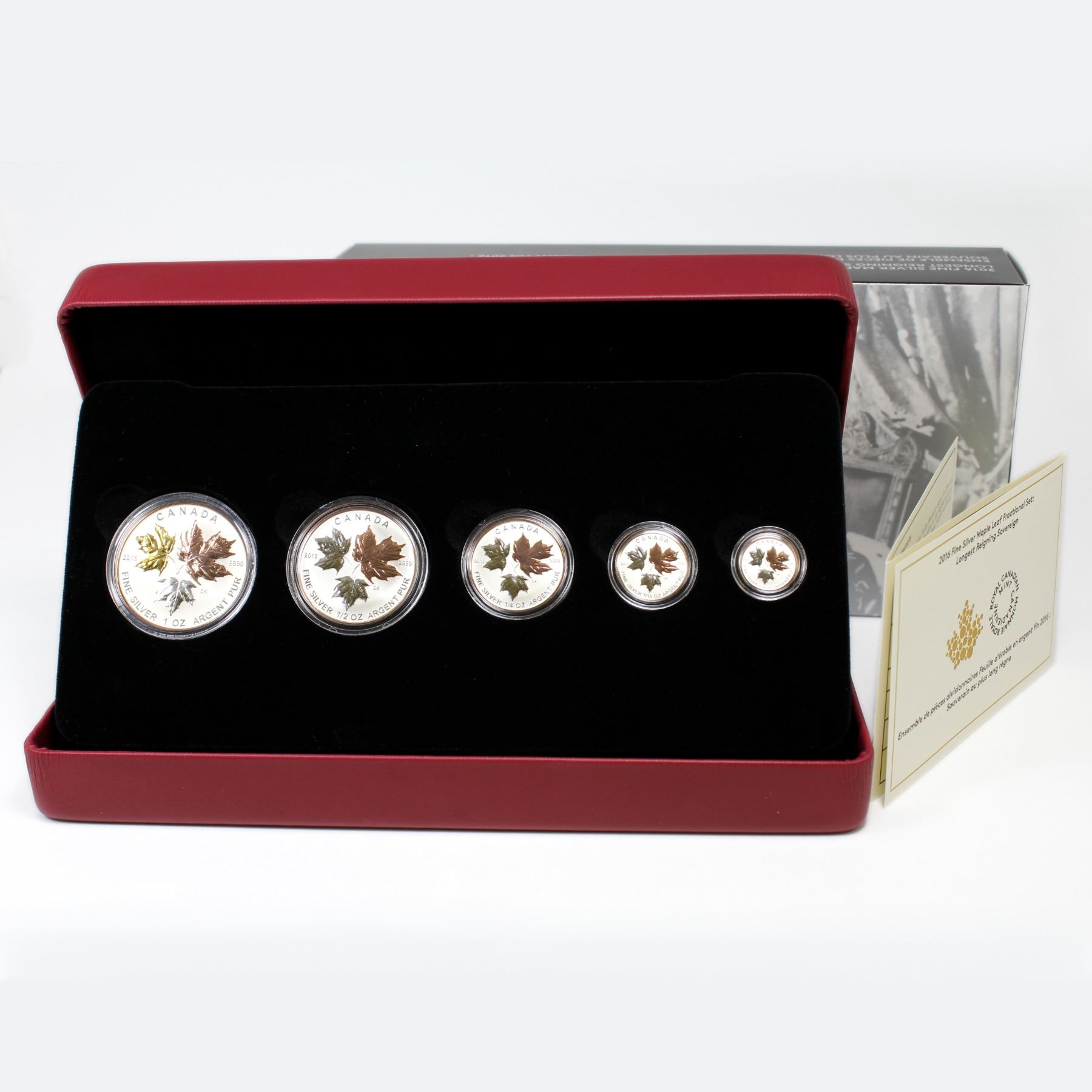 2016 A Historic Reign Silver Maple Leaf 5-coin Fractional Set Featuring 1oz, 1/2oz, 1/4oz, 1/10oz & 1/20oz Fine Silver Rose Gold Plated Coins (Outer sleeve lightly scuffed). Mintage of 7500. (TAX Exempt)
