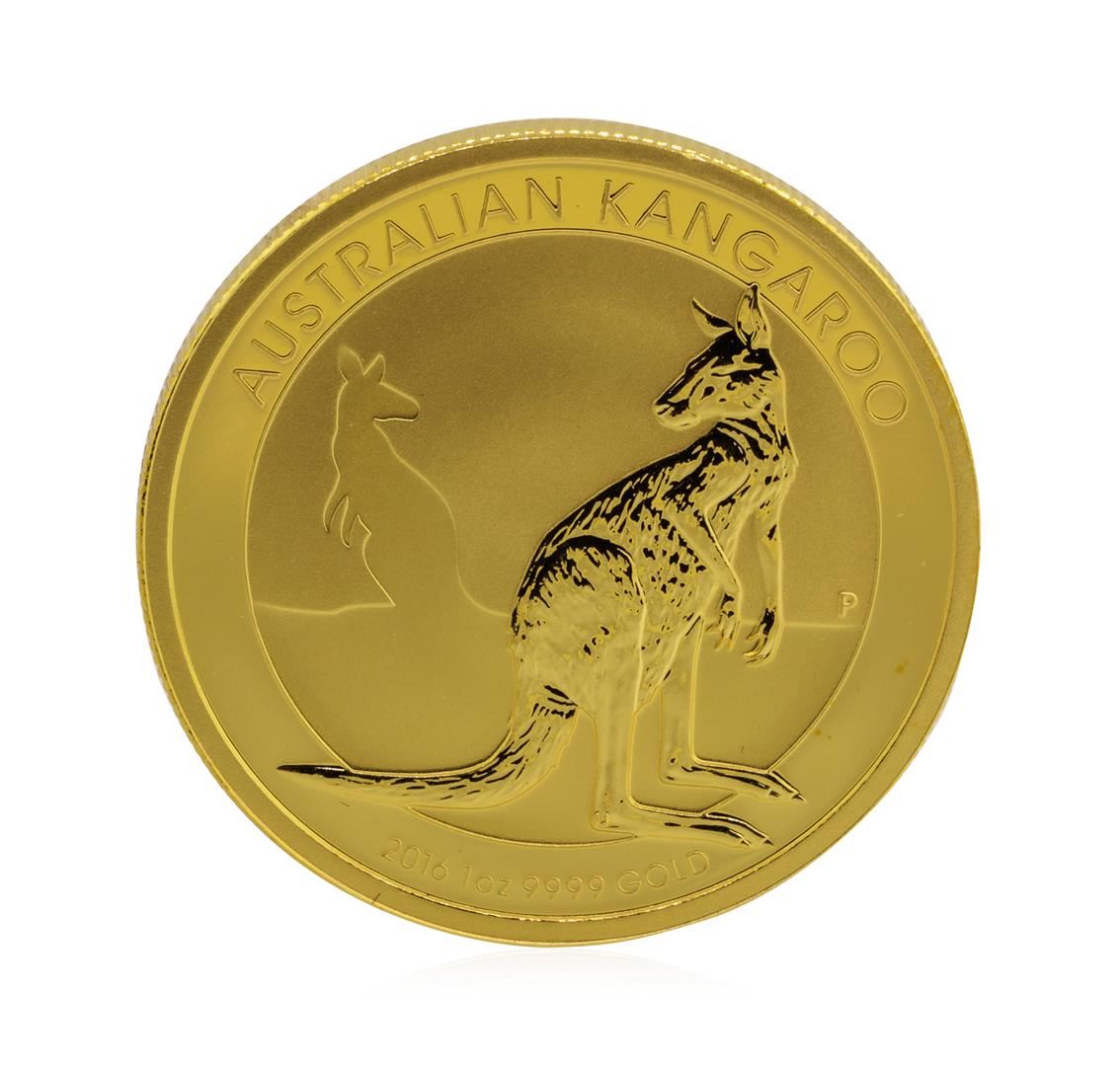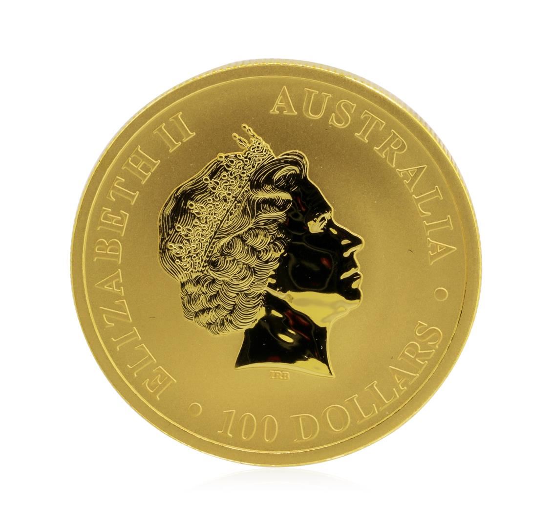 One 2016 AU$100 Queen Elizabeth Australian Kangaroo coin weighing one troy ounce.