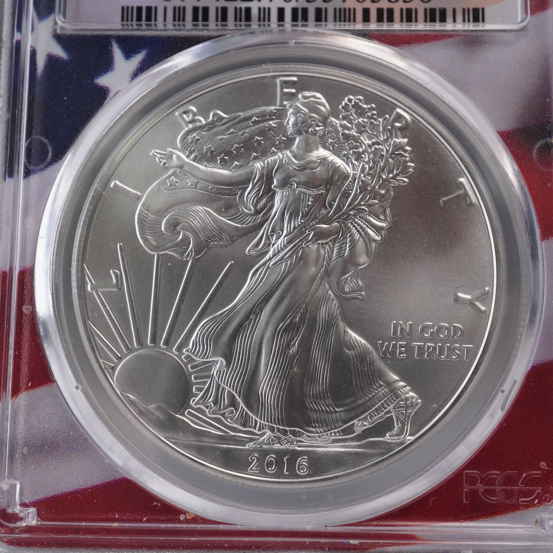 United States Mint silver bullion coin dated 2016, commemorating the 30th anniversary of the American Silver Eagle series. Obverse features the iconic Walking Liberty design by Adolph A. Weinman, portraying a full-length figure of Liberty striding confidently toward the sun with her right hand extended forward and branches of laurel and oak held in her left. Draped in the folds of the American flag, Liberty is encircled by inscriptions including LIBERTY and IN GOD WE TRUST, along with the date 2016 near the rim. Reverse presents the classic heraldic eagle design by John Mercanti, a detailed rendering of the United States Coat of Arms. The eagle displays outstretched wings and holds a bundle of arrows in its left talon and an olive branch in its right, with a banner in its beak inscribed E PLURIBUS UNUM. Thirteen stars are positioned above the eagle, representing the original colonies. Surrounding inscriptions read UNITED STATES OF AMERICA, 1 OZ. FINE SILVER-ONE DOLLAR. The coin is struck in .999 fine silver and officially graded MS70 (Mint State 70) by PCGS, indicating a perfect, uncirculated condition. Housed in a tamper-evident slab with an American flag background, the holder is labeled with PCGS and marked with the 30th Anniversary designation. Slab: 2.5"L x 0.5"W x 3.25"H. Coin diameter: 39mm.