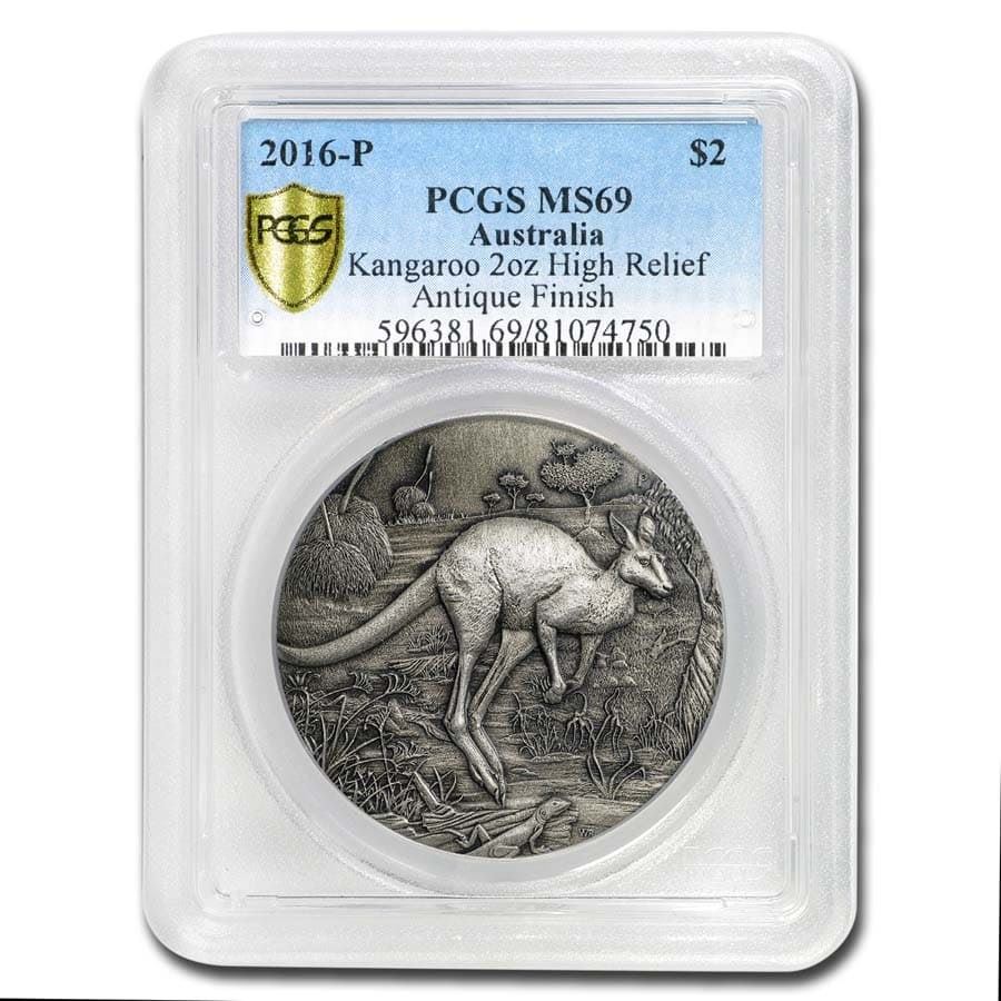 2016 Australia 2 oz Silver HR Kangaroo MS-69 PCGS (Antiqued)