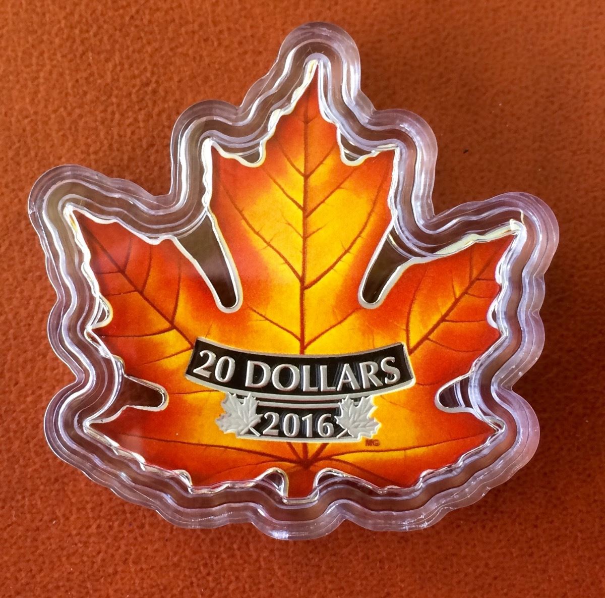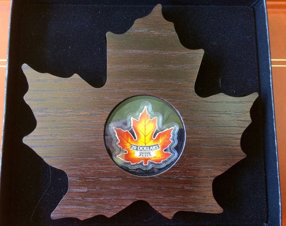 2016 Canada $20 Fine Silver - Colourful Maple Leaf Shaped, No Tax, C.O.A. Box &Sleeve