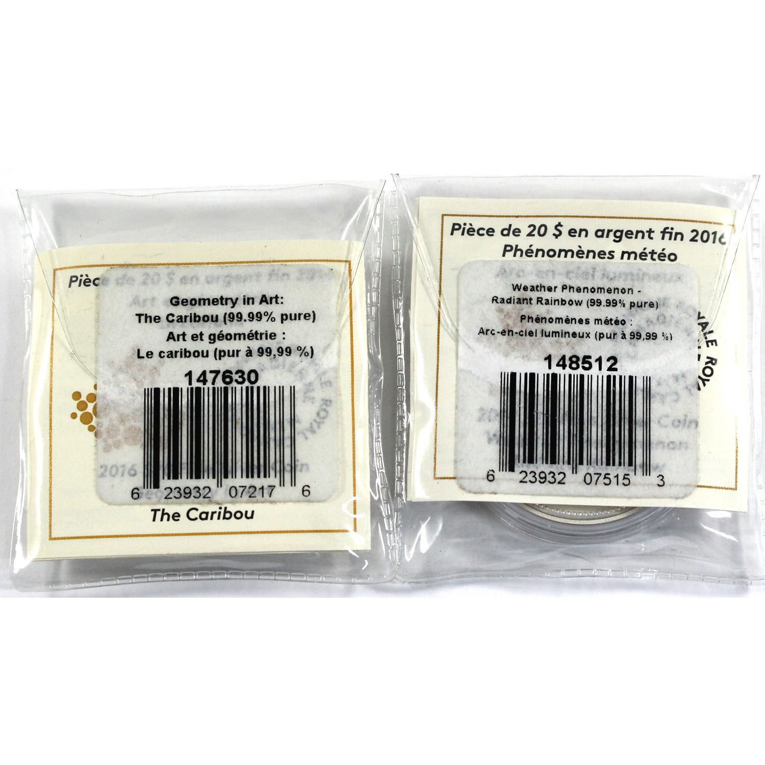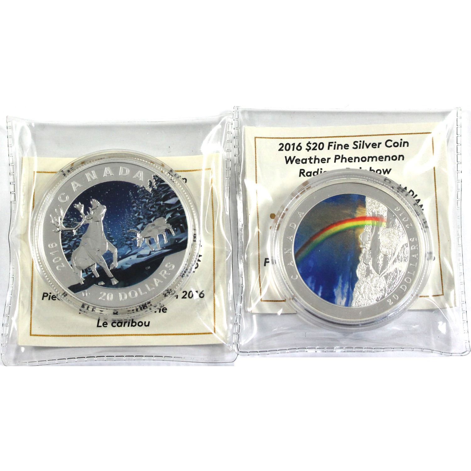2016 Canada $20 Geometry In Art - The Caribou & 2016 $20 Weather Phenomenon - Radiant Rainbow Fine Silver Coloured Coins Encapsulated with COAs in Sealed Mint Pouches. 2pcs (TAX Exempt)