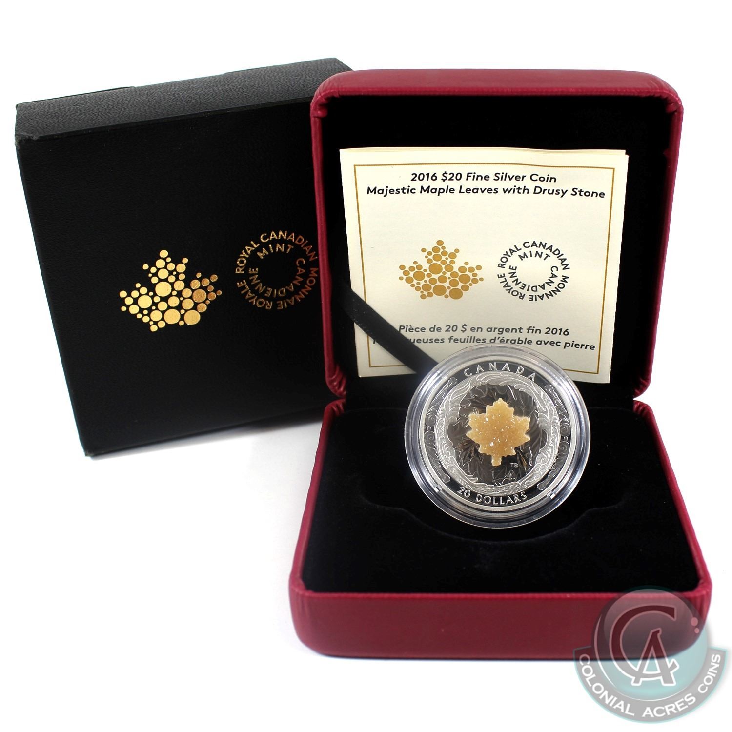 2016 Canada $20 Majestic Maple Leaves with Drusy Stone Fine Silver Coin. (TAX Exempt) Outer sleeve is lightly worn.