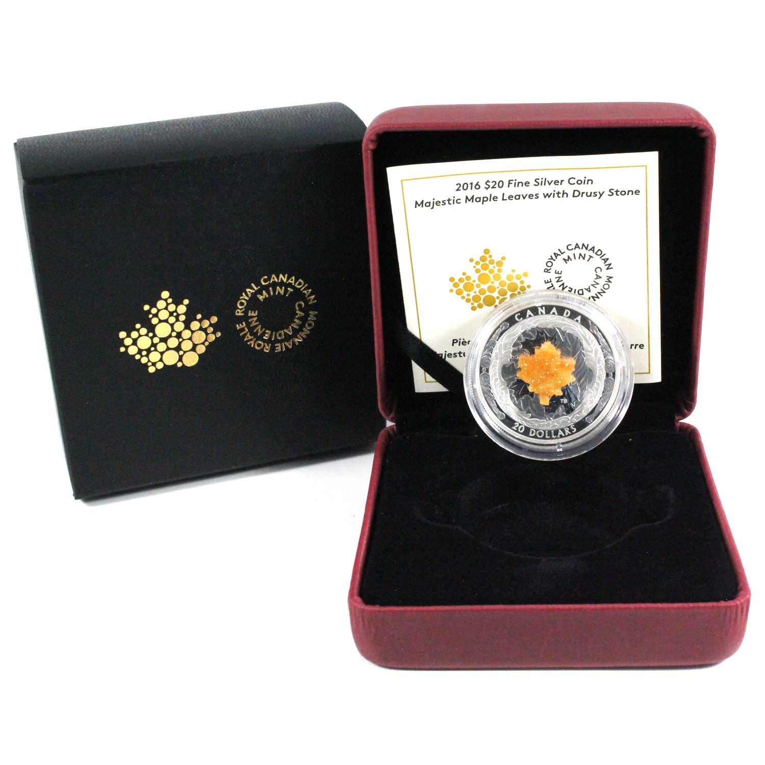 2016 Canada $20 Majestic Maple Leaves with Drusy Stone Fine Silver Coin.