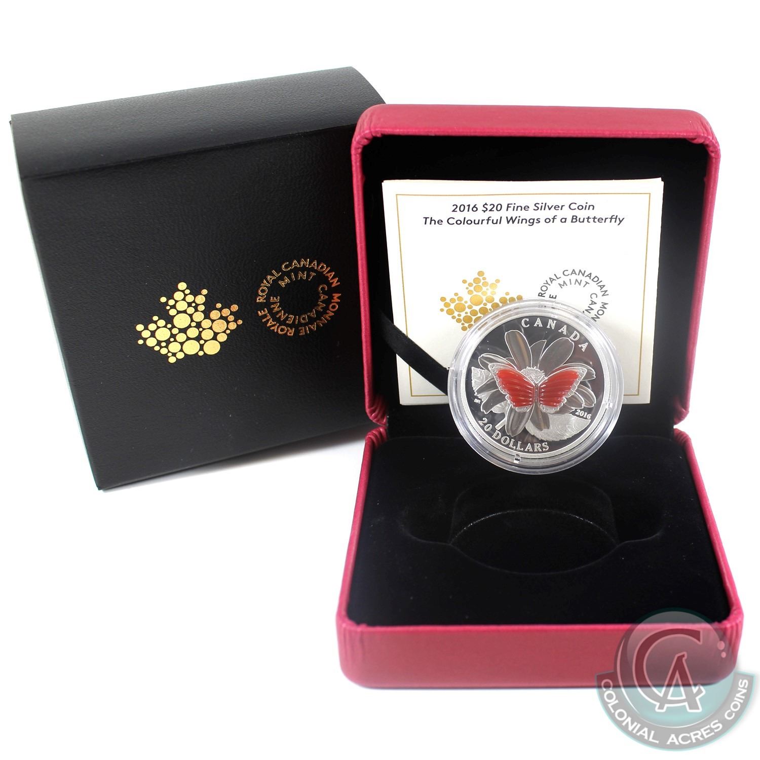 2016 Canada $20 The Colourful Wings of a Butterfly Fine Silver Coin (Display case has black colour on the top). (TAX Exempt)