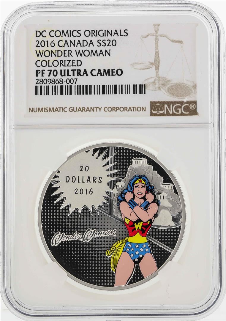 One 2016 Canada $20 Wonder Woman Colorized Silver Coin NGC PF70 Ultra Cameo. NGC Certified.