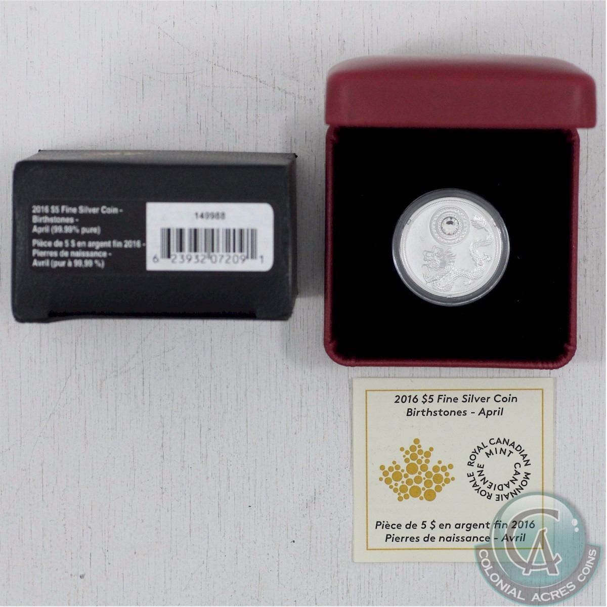 2016 Canada $5 April Birthstone Fine Silver Coin (TAX Exempt). Outer box is lightly worn, however, c
