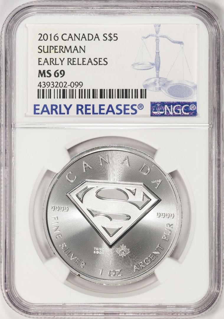 One 2016 Canada $5 Superman Silver Coin NGC MS69 Early Releases. NGC Certified.