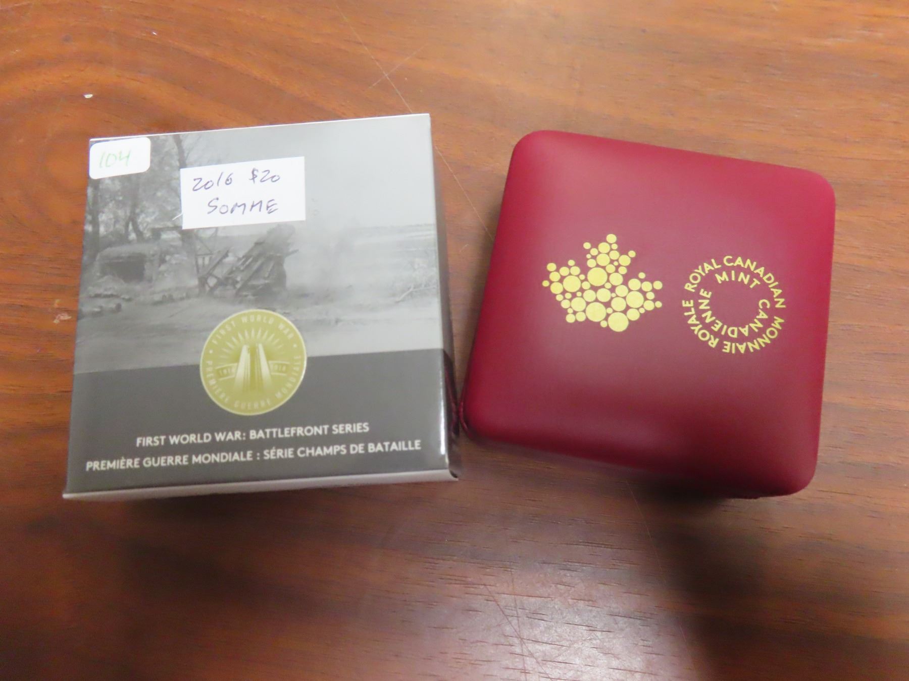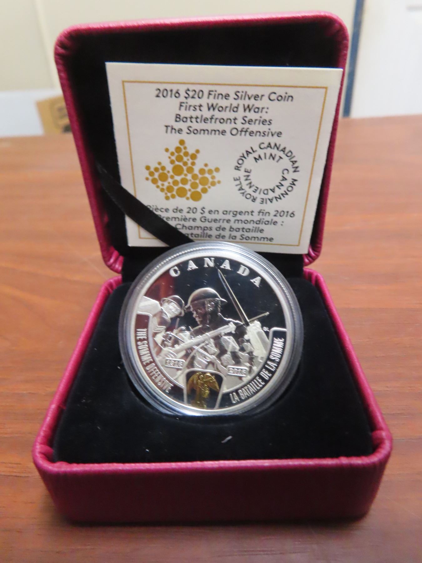 2016 First World War Battlefront Series: The Somme Offensive $20. 99.99% pure Silver with gold plating. Proof with Ultra Heavy Cameo. Housed in its original Royal Canadian Mint case & box of issue. Includes Certificate of Authenticity.