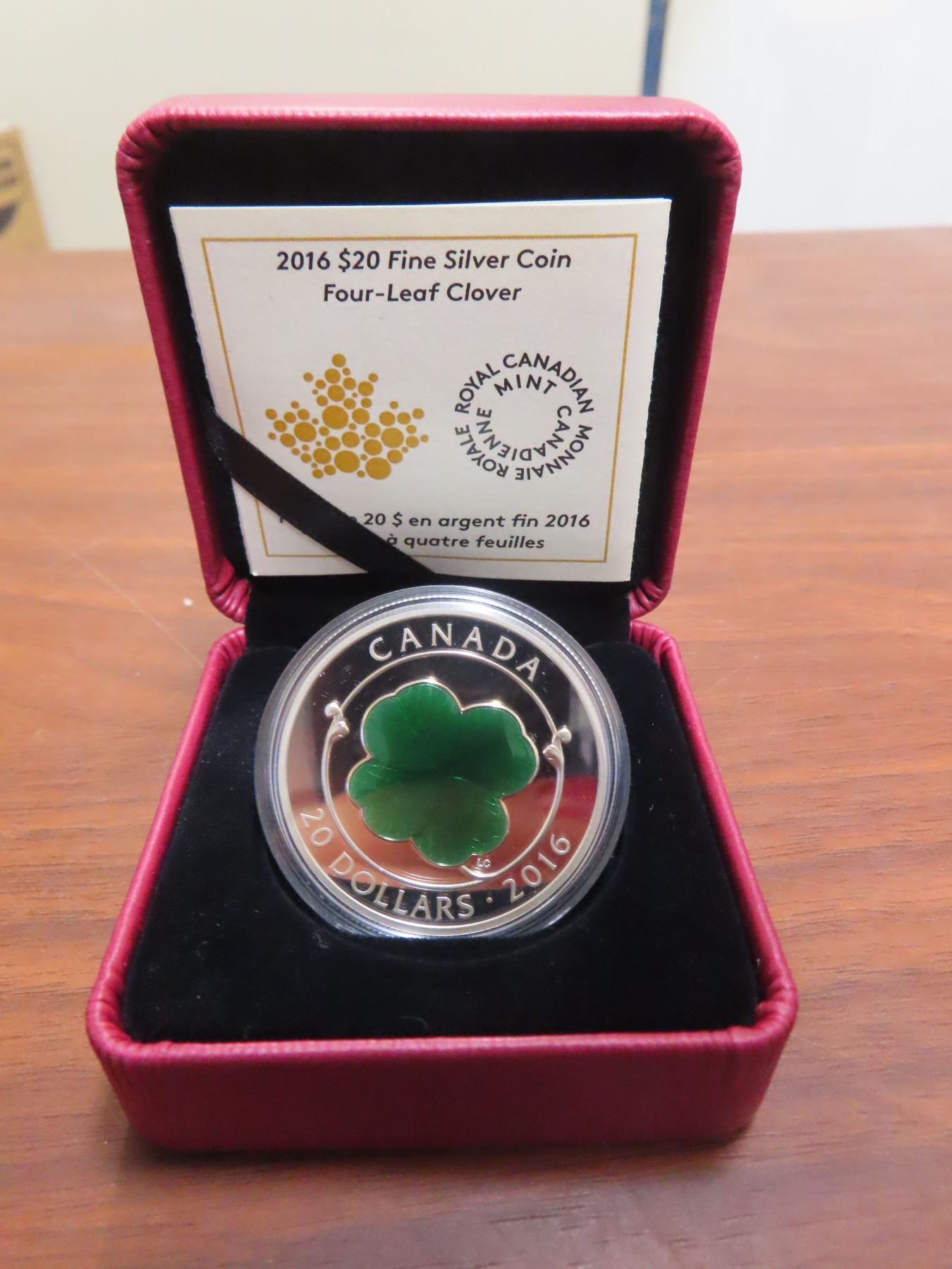 2016 Four-Leaf Clover $20. Translucent green enamel. 99.99% pure Silver. Proof with Ultra Heavy Cameo. Housed in its original Royal Canadian Mint case & box of issue. Includes Certificate of Authenticity.