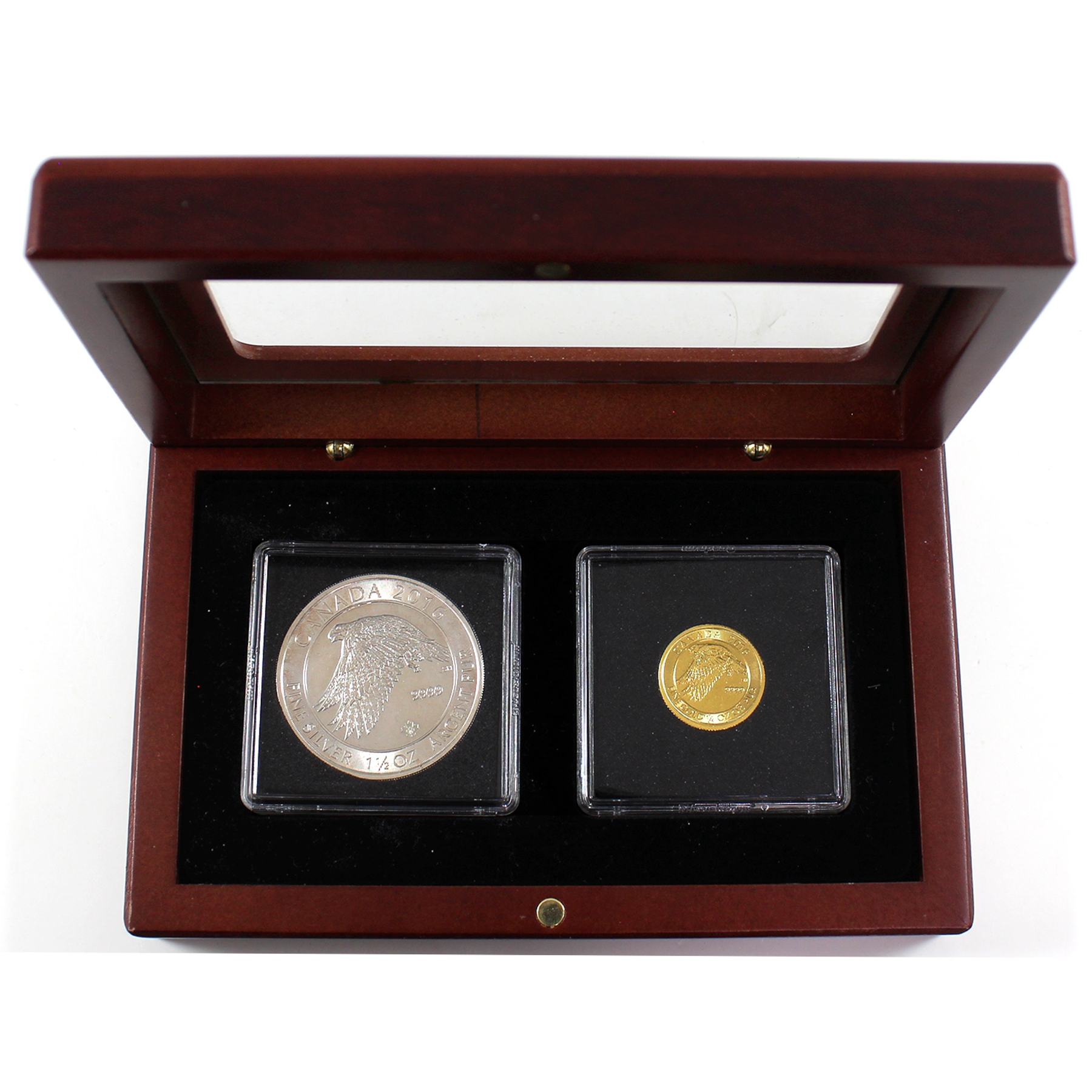 Set includes one 1.5oz $5 silver coin & one 1/4oz $10 gold coin. Set comes in a wooden box from Canadian Coins & Currency. Capsule of silver coin does not close. (Tax Exempt)