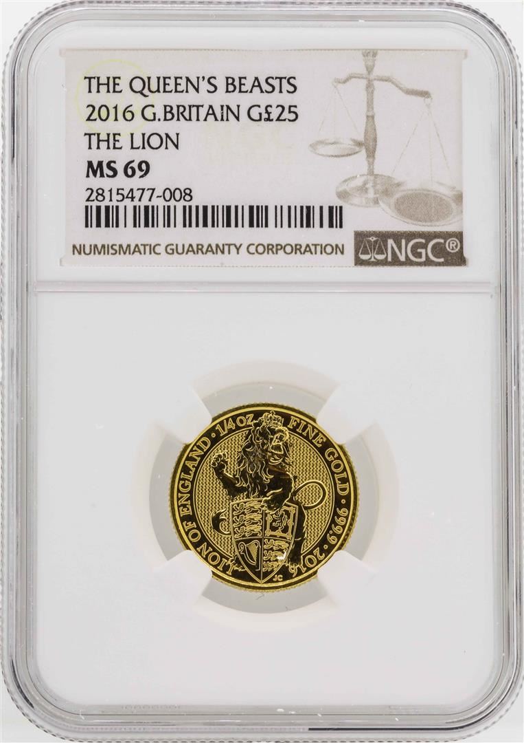 One 2016 Great Britain 1/4 oz. The Queens Beast The Lion Gold Coin NGC MS69 . NGC Certified.