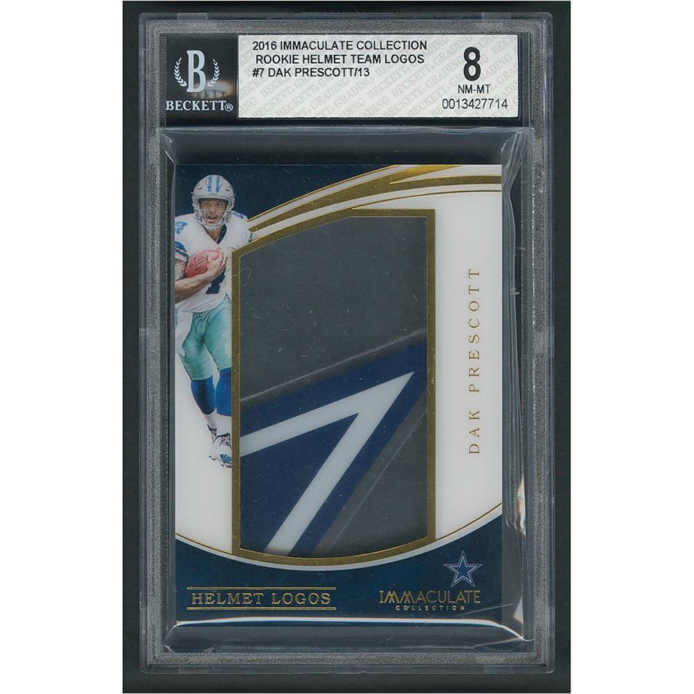 Graded by BGS NM-MT 8. Amazing player-worn helmet logo relic card of Dallas Cowboys star quarterback Dak Prescott, numbered 4/13, boasting a segment of the team's iconic 'Lone Star' logo. Following a successful season in which he threw for 3667 yards and completed 23 touchdown passes, Prescott was named the 2016 NFL Offensive Rookie of the Year.