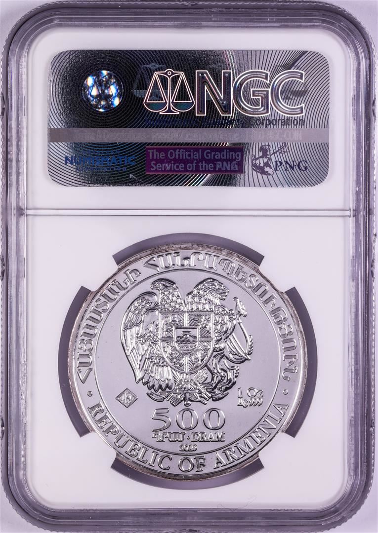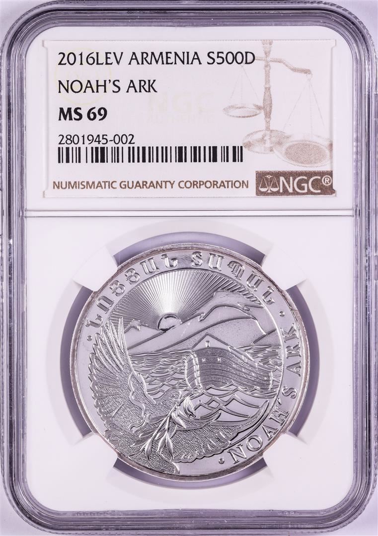 One 2016-LEV Armenia 500 Dram Noah's Ark Silver Coin NGC MS69. NGC Certified.