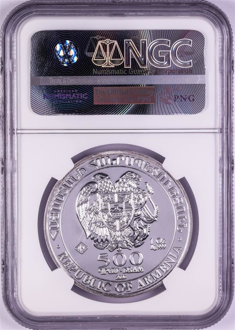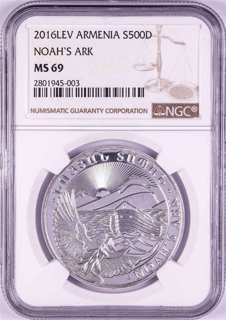 One 2016-LEV Armenia 500 Dram Noah's Ark Silver Coin NGC MS69. NGC Certified.