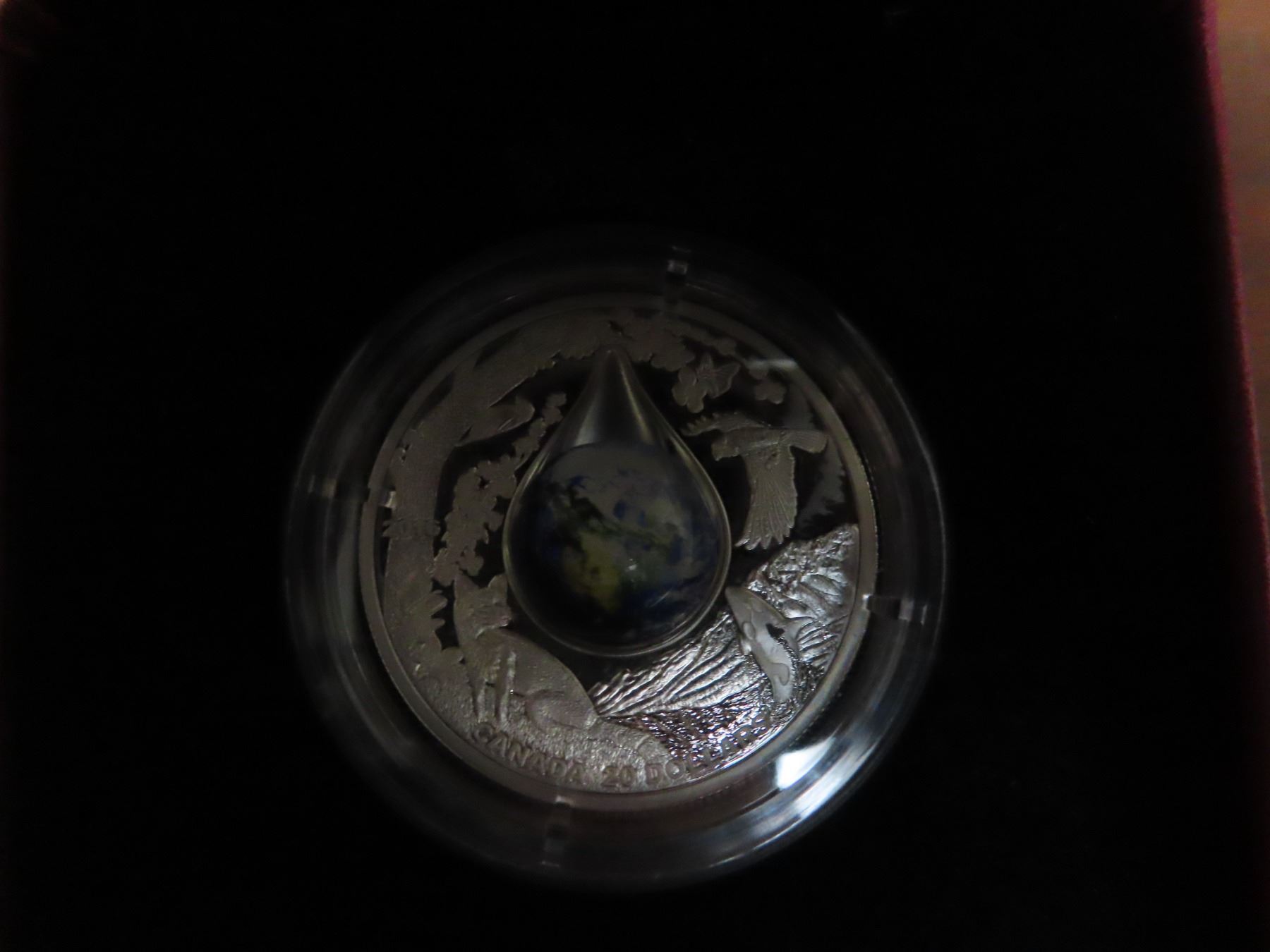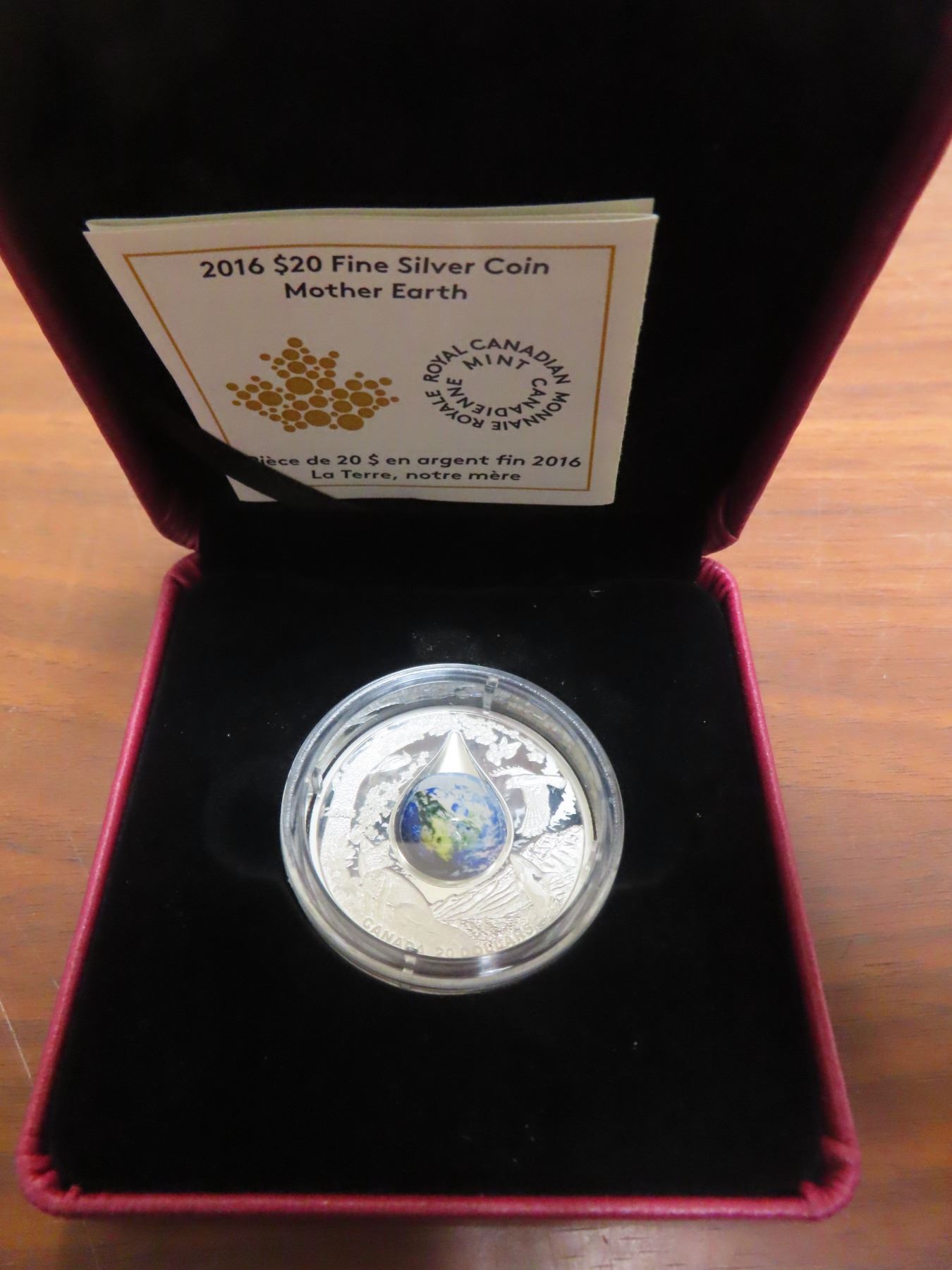 2016 Mother Earth $20. Features a red fox representing land, kestrel & woodpecker representing air, and an orca representing water. 3D droplet at the centre highlights the importance of water in all life on Earth. 99.99% pure Silver. Proof with Ultra Heavy Cameo. Housed in its original Royal Canadian Mint case & box of issue. Includes Certificate of Authenticity. Scarce.