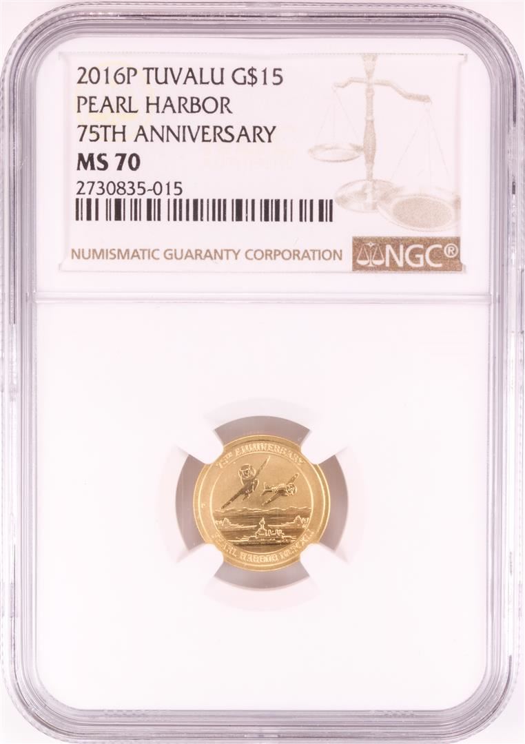 One 2016-P $15 Tuvalu Pearl Harbor 75th Anniversary Gold Coin NGC MS70. NGC Certified.