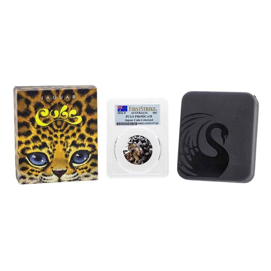 One 2016-P Australia 50 Cent Jaguar Cubs Colorized Silver Coin PCGS PR69DCAM. PCGS Graded.