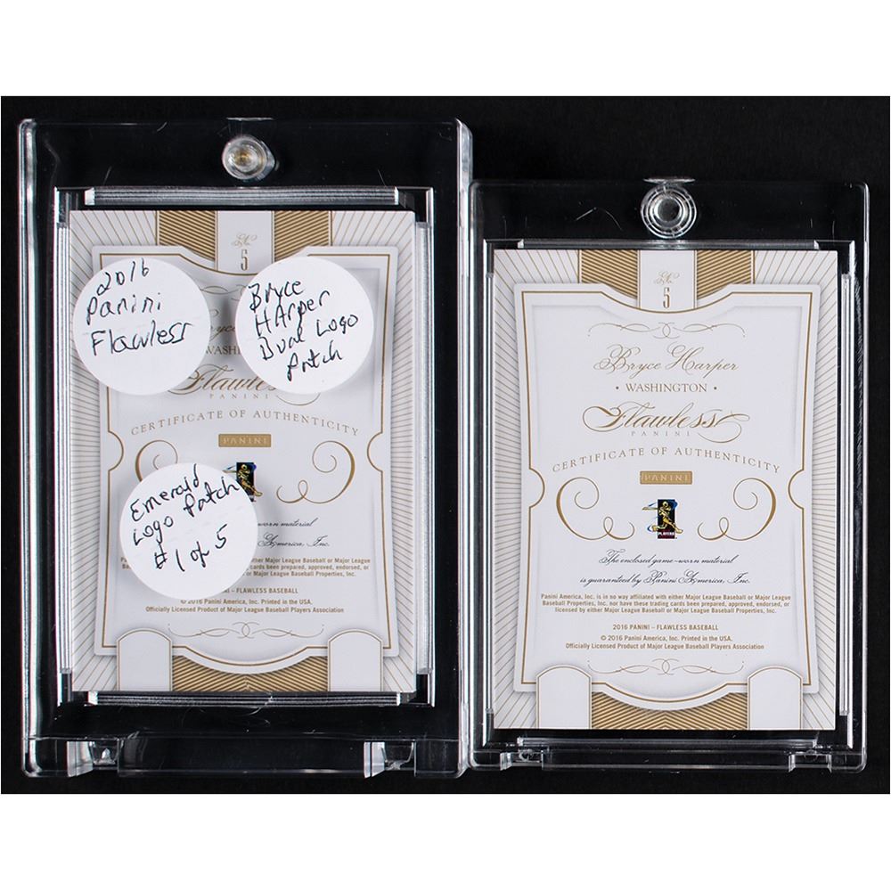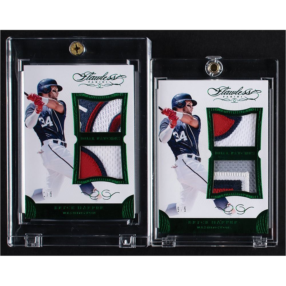 Scarce pairing of two game-worn patch relic cards of Bryce Harper, representing the first and last examples from an ultra-limited run: super rare dual logo patch cards, numbered 1/5 and 5/5, both with two multi-colored swatches of game-worn material. The highlight of the pair is a segment of the circular Washington Nationals sleeve patch, seen on the first card in the sequence. A superlative duo from the perennial All-Star and two-time MVP.