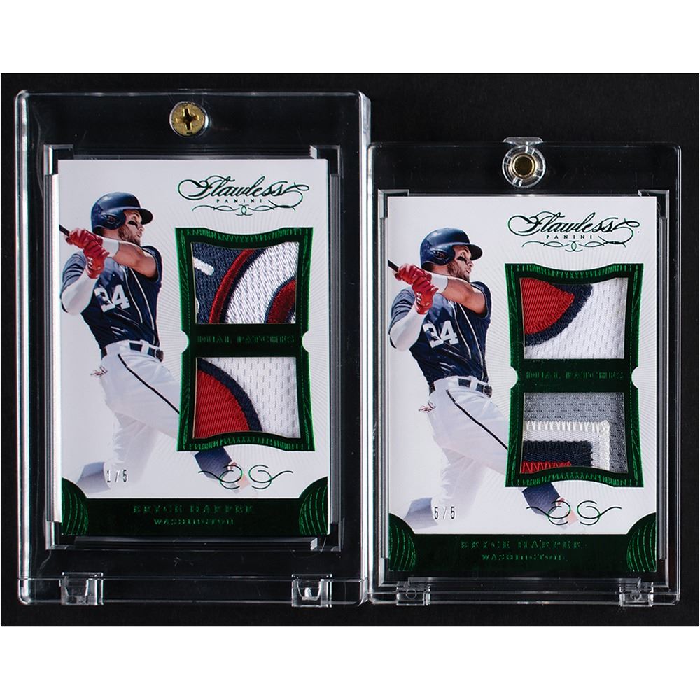 Scarce pairing of two game-worn patch relic cards of Bryce Harper, representing the first and last examples from an ultra-limited run: super rare dual logo patch cards, numbered 1/5 and 5/5, both with two multi-colored swatches of game-worn material. The highlight of the pair is a segment of the circular Washington Nationals sleeve patch, seen on the first card in the sequence. A superlative duo from the perennial All-Star and two-time MVP.